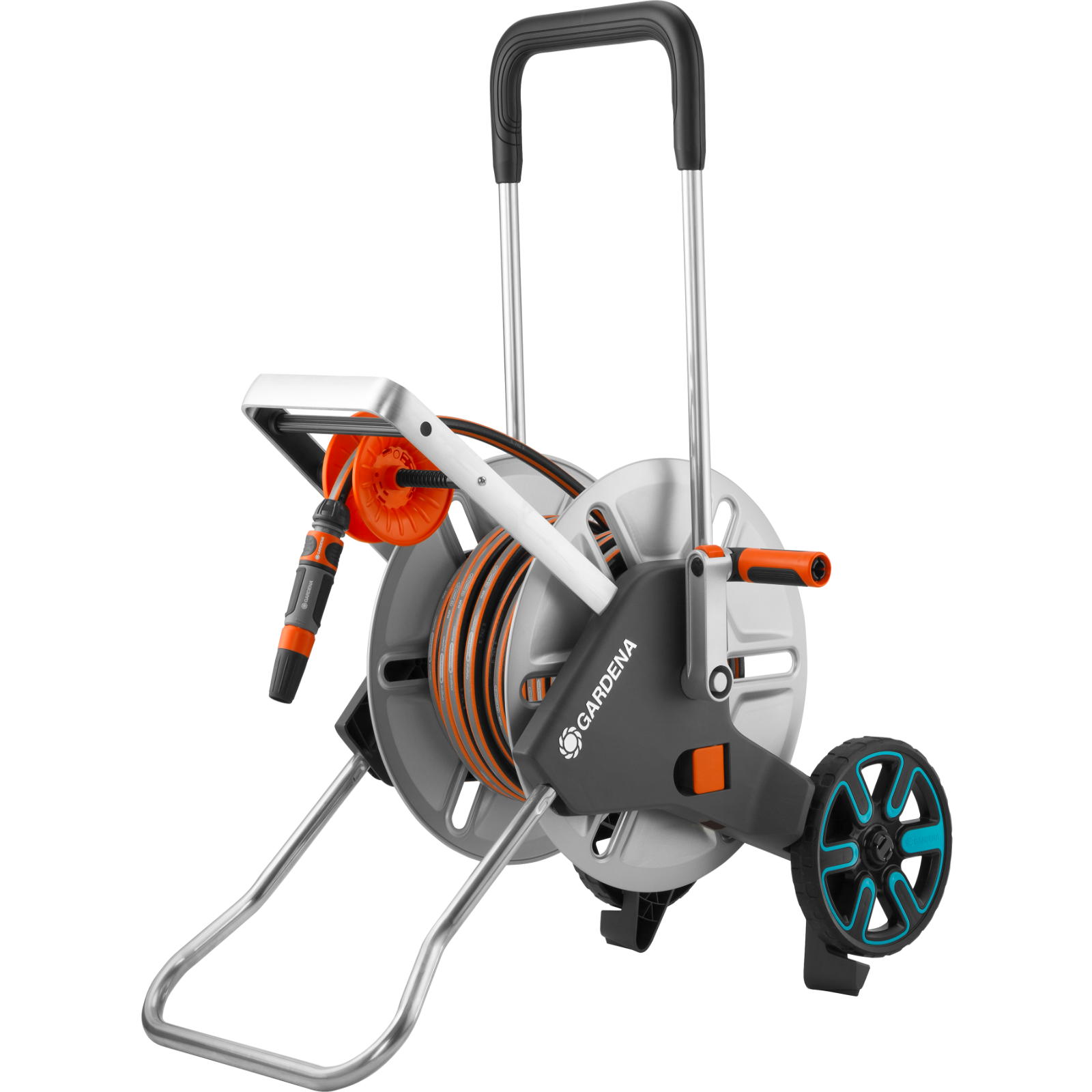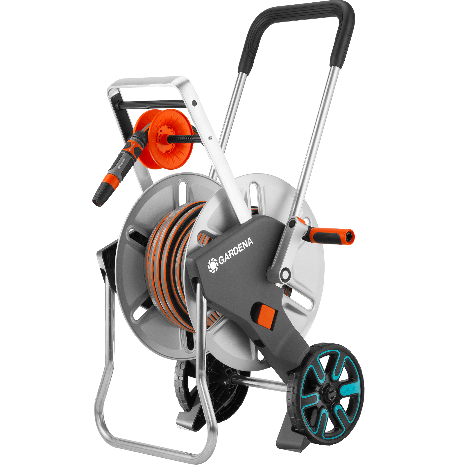 Profi Metall-Schlauchwagen von Gardena.Robuste Ausführung mit großen Räder, sicheren Stand und Einlaufrolle für einfaches Aufrollen.Aktions-Set mit 25m hochwertigen 1/2 Zoll Gardena FLEX-Schlauch, Spritze und erforderlichen Systemteilen.Fertig montiert.