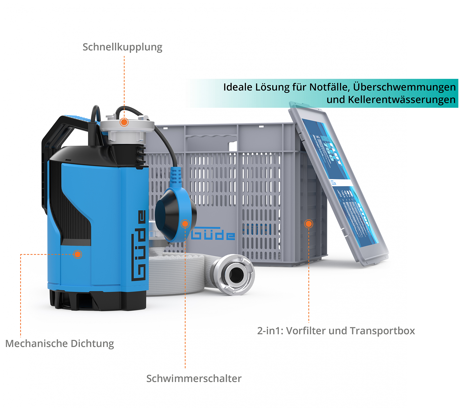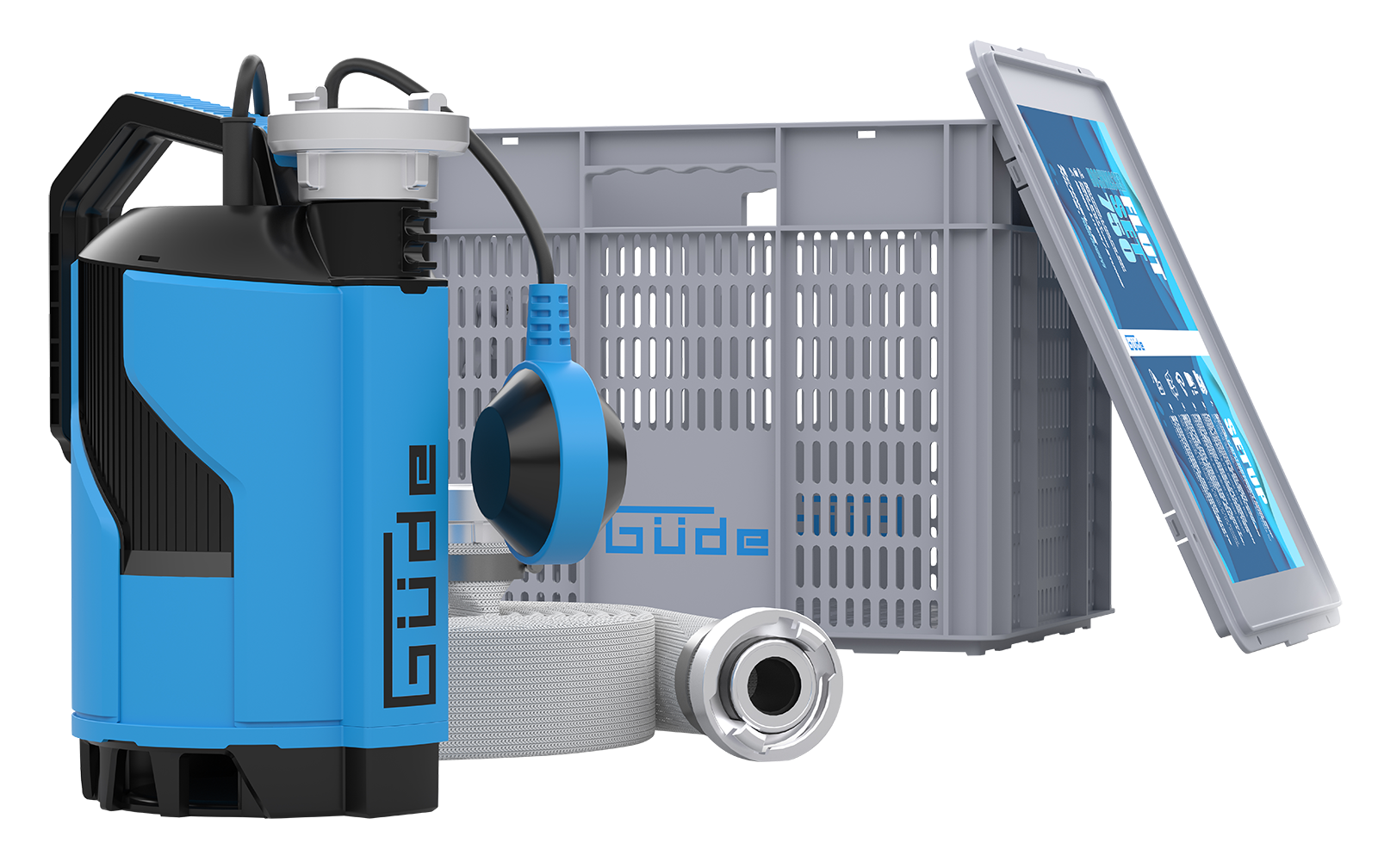 Praktisches Set für das Abpumpen von Schutzwasser aus Keller, Garagen usw. nach Überschwemmungen, Hochwasser und dgl.Bestehend aus einer Schmutzwasserpumpe mit 750Watt/230Volt, bis Korngröße 22mm, Förderleistung bis 12.000L/h, Förderhöhe bis 8m, komplett mit C-Kupplung und 10m Druckschlauch sowie einer stabilen Transportbox mit schlitzen zur Aufbewahrung oder aus Filterkorb .