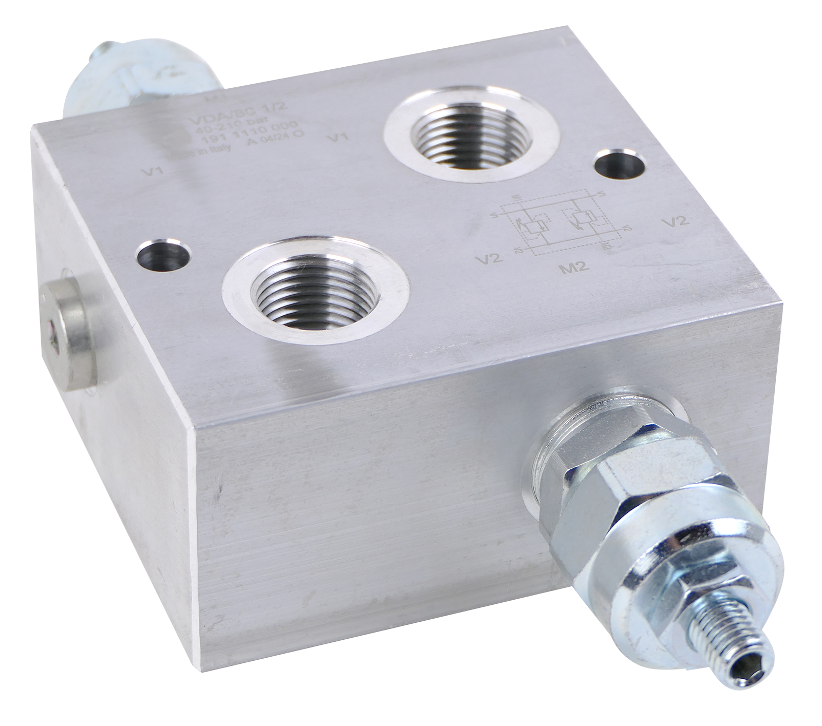 Das Ventil dient zur Überdruck- bzw. Überlastsicherung in 2 Druckleitungen. Es ist sowohl als Schockventil wie auch als Druckbegrenzungsventil für Dauerbetrieb verwendbar. Das Ventil ist ein idealer Schutz gegen plötzlich auftretende Druckstöße und ermöglicht das Einstellen unterschiedlicher Drücke an zwei Eingängen des Hydrauliksystems. Das Schockventil wird zur Absicherung von Hydraulikmotoren, Gleichlaufzylindern und Systemen mit gleich großem Hubvolumen verwendet. Z.B. die Absicherung von Schneepflugzylindern die während des Betriebes ständig externen Kräften und Belastungen ausgesetzt sind. Schockventile positioniert man so nahe als möglich am Verbraucher welcher abgesichert werden soll.Einstellbarer Druckbereich: 40 - 210 bar