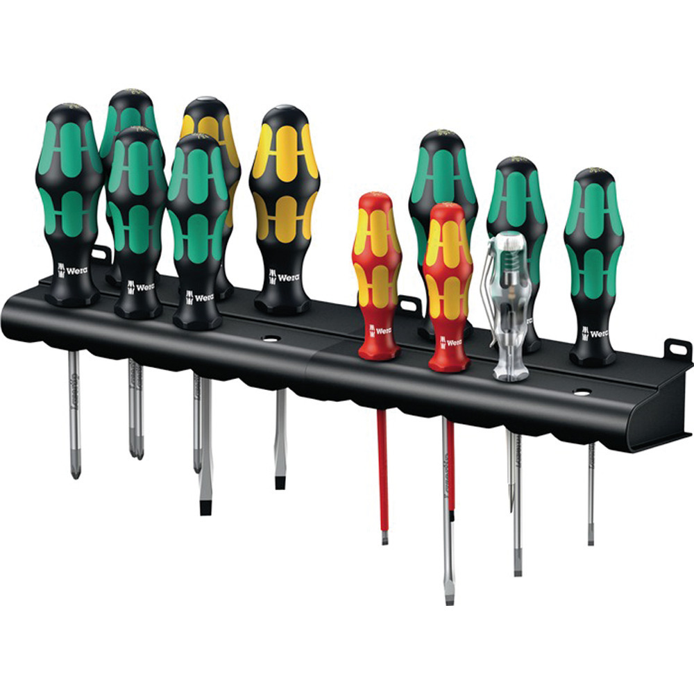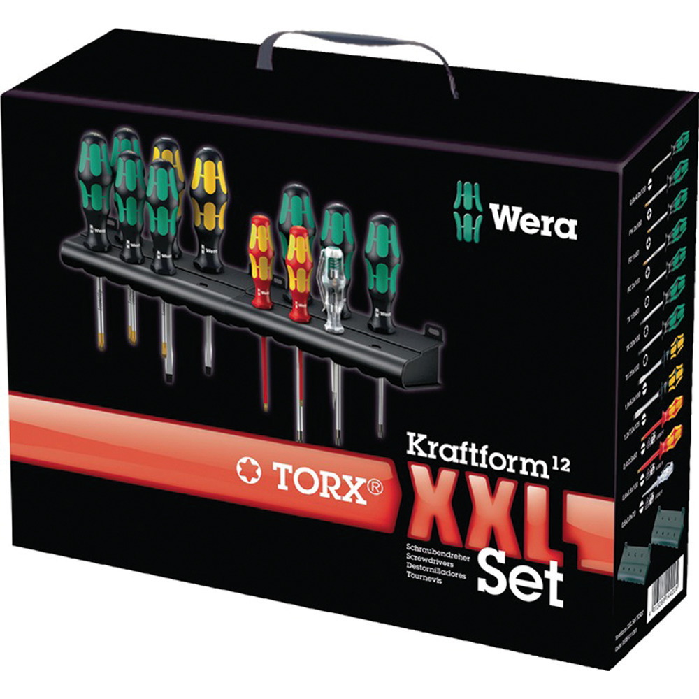 Komplett Set mit hochwertigen Schraubendrehern mit ergonomischen Mehrkomponenten Kraftform Griffen mit 6-kant Abrollschutz. Mit praktisch allen gängigen Schraubendrehern bestückt, mit innovativen Laser Tip Spitzen für noch besseren Halt beim Schrauben. Klingen aus bärenstarkem Molybdän – Vanadium Stahl. Lieferung sortiert in edler Transportverpackung inklusive praktischer Wandhalterung.Inhalt:je 1 Schraubendreher VDE-isoliert für Schlitzschrauben, 2,5 x 80 mm - 3,5 x 100 mm1 Spannungsprüfer 3,0 x 70 mm1 Schraubendreher für Schlitzschrauben, 4,0 x 100 mmje 1 Schraubendreher für Schlitzschrauben mit durchgehender 6-kant-Klinge, Schlagkappe und Sechskantansatz, 5,5 x 100 - 7,0 x 125 mm, mit BlackPoint Spitze und Schlüsselhilfe (zum Schrauben, Meißeln und Stemmen)1 Schraubendreher für Schrauben mit Kreuzschlitz (PH), Gr. 2 x 100 mmje 1 Schraubendreher für Schrauben mit Kreuzschlitz (PZD), Gr. 1 x 80 - 2 x 100 mmje 1 Schraubendreher für Schrauben mit Innen-TORX®-Profil, Gr. T15 - T20 - T25