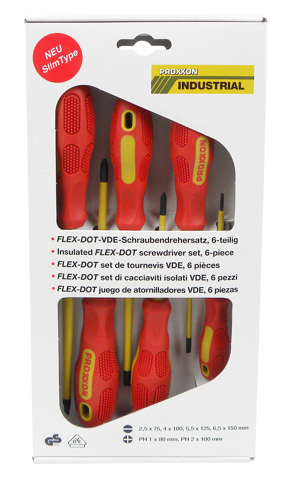 VDE-Schrauben­dreher für sicheres Arbeiten an spannungs­führenden Teilen bis 1.000 V-Wechsel­spannung.Auf die Klinge gespritzte Schutzisolation, Stück für Stück geprüfte Sicherheit.Schlitz: 2,5 - 4,0 - 5,5 - 6,5PH 1 - PH 2