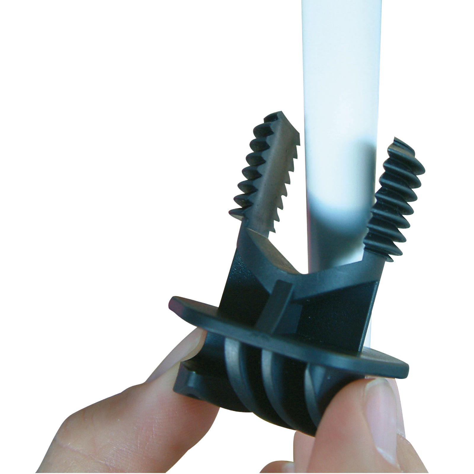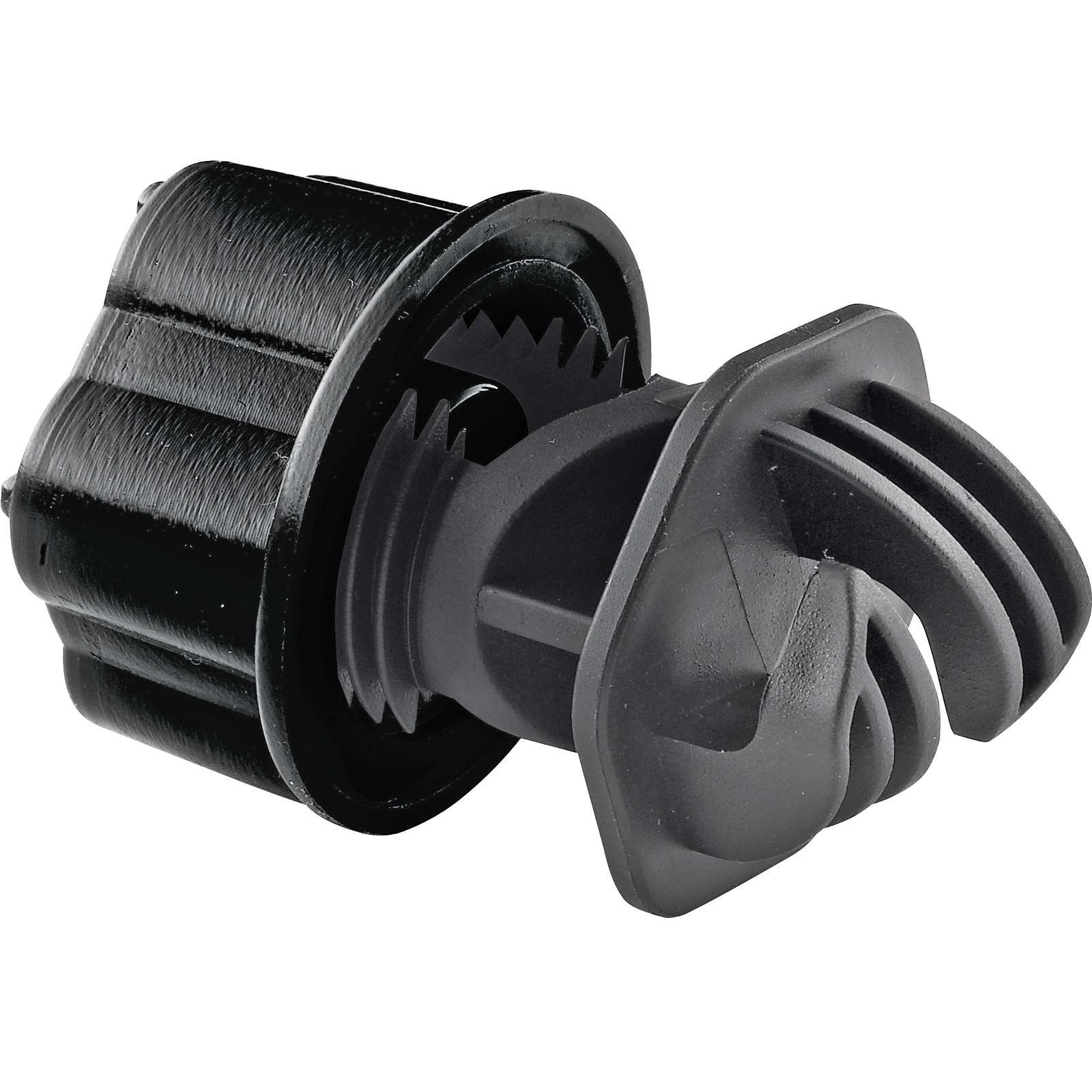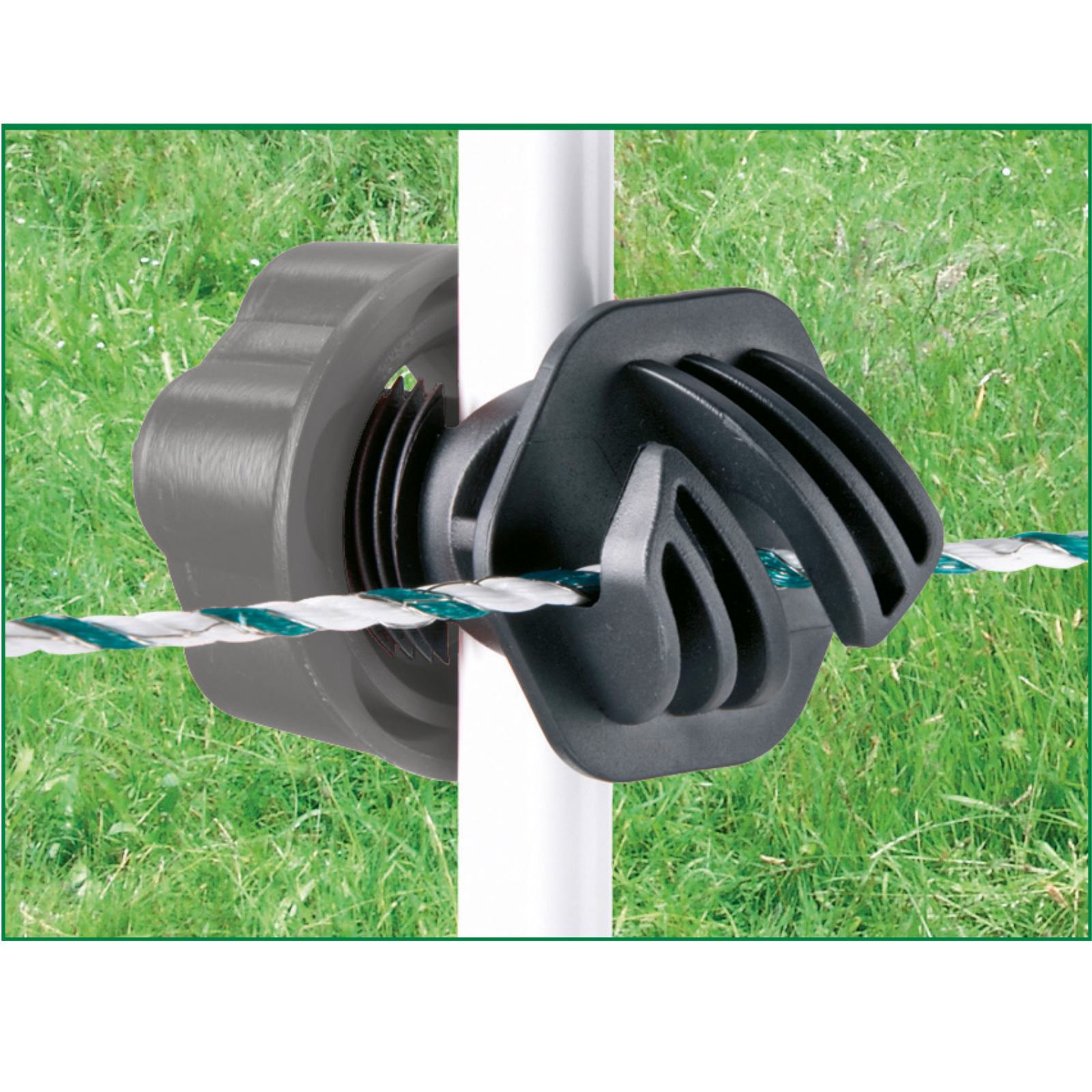 Klemmisolator mit Schraubgewinde für Metall- oder Kunststoffpfähle von 6 bis 17 mm Ø.Anwendung: seitlich aufstecken und festdrehen.Für Draht, Litze, Seil und Band bis 10 mm. Pack = 10 St.