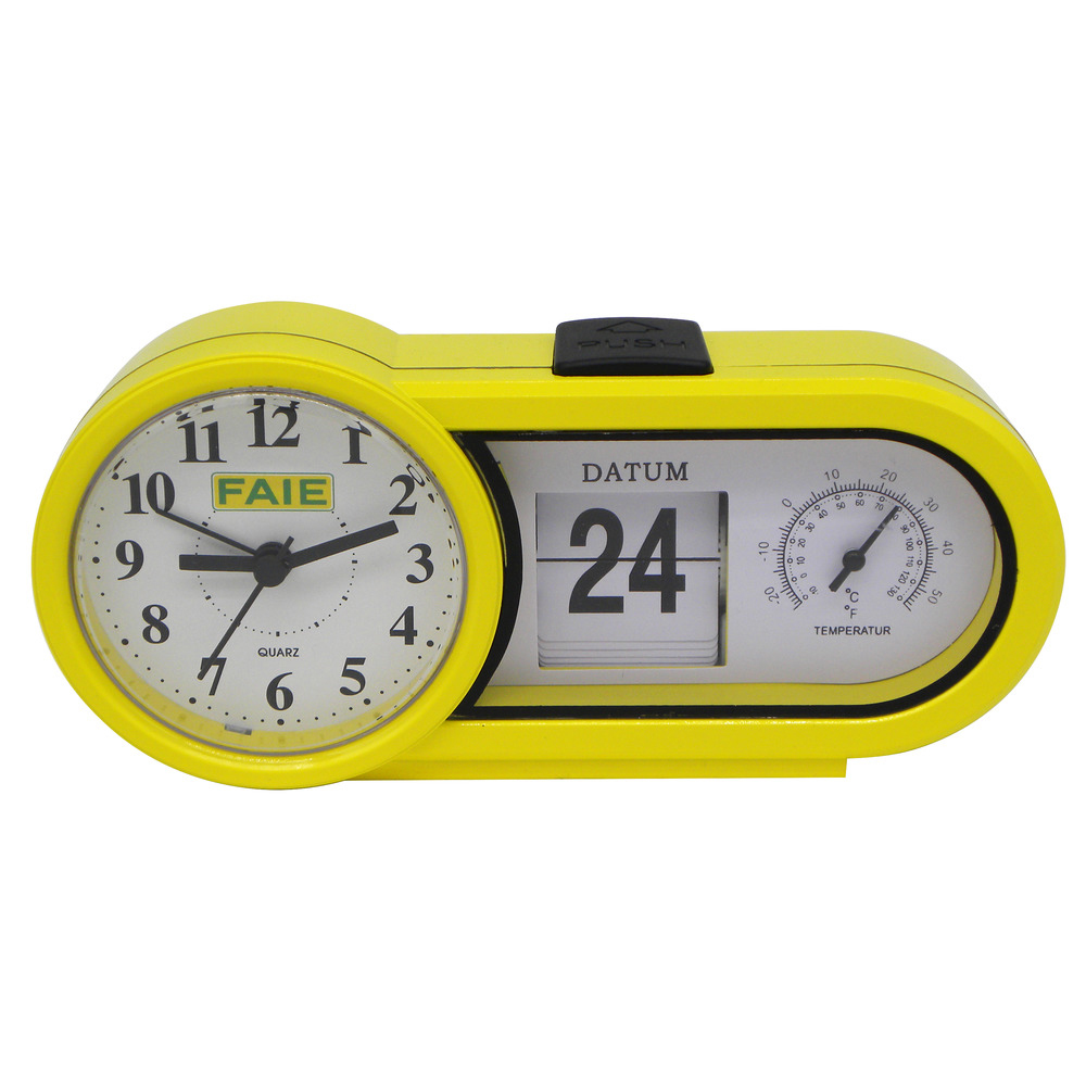 Praktische Standuhr im Retrodesign mit integriertem Thermometer und großer Datumsanzeige.