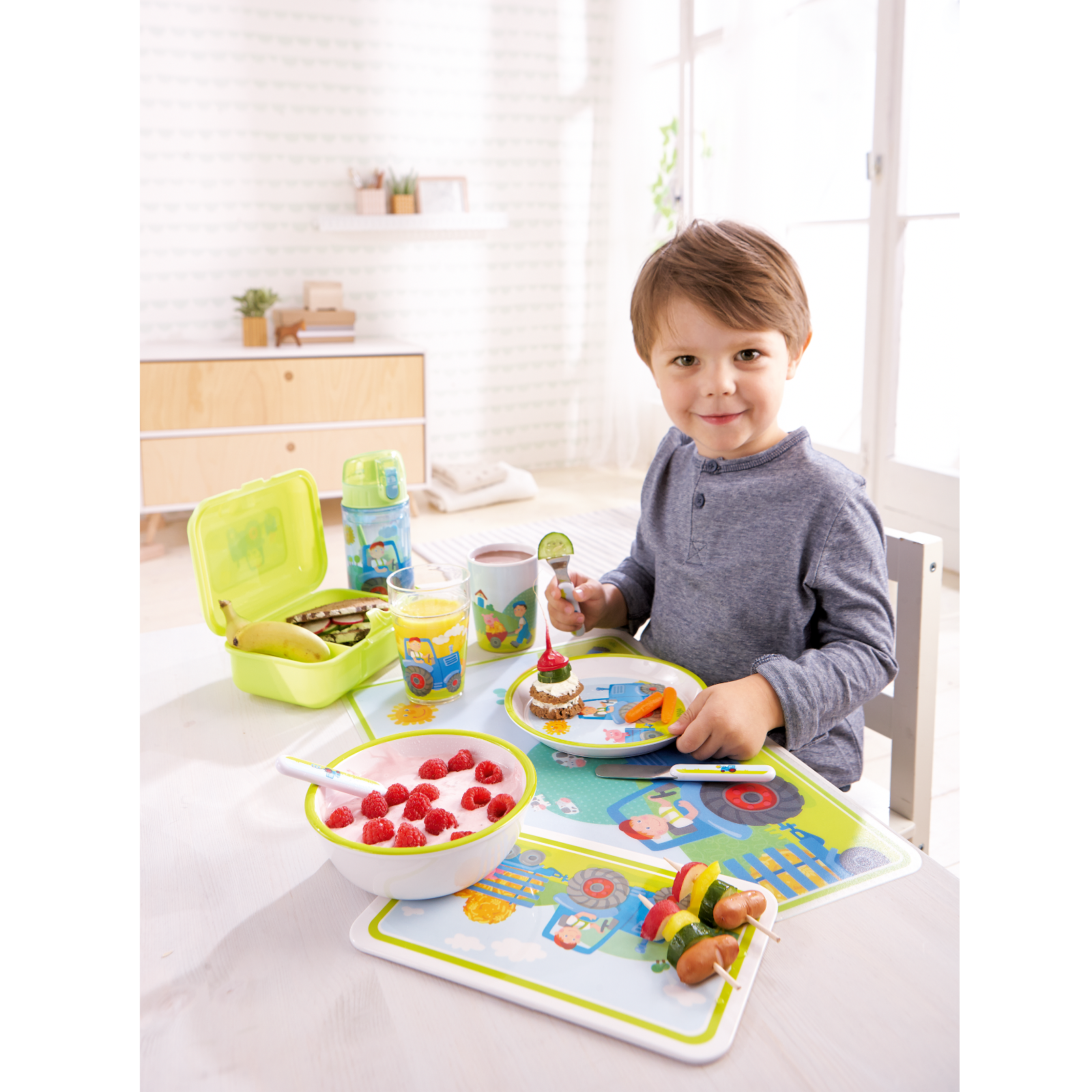 Kinderschüssel Ø 14,5 cm/ Höhe ca 5 cm, aus Melamin für Kinder ab 6 Monaten. Rutschfest dank Gummiring! Dekor TraktorDamit wird jede Mahlzeit zum Vergnügen. Ist Schüssel einmal leer gegessen, gibt es viel für Traktorfans zu sehen! Danach geht's ab in die Spülmaschine, damit die pflegeleichte Kinderschüssel aus robustem Melamin schnell wieder bereit für die nächste Mahlzeit ist. Der hohe Rand erleichtert das Löffeln und ein Gummiring sorgt dafür, dass sie gut am Tisch steht und nicht verrutscht. So unterstützen sie Kinder bei ersten Löffel-Experimenten. Die Melamin-Schüssel Traktor ist ein liebevoll gestaltetes Kindergeschirr aus der HABA-Serie für Kinder ab 6 Monaten.HinweiseMelamingeschirr ist ein Essgeschirr, kein Kochgeschirr und sollte in Verbindung mit Lebensmitteln nur Temperaturen bis max. 70°C ausgesetzt werden. Nicht geeignet zum Speisen erwärmen in der Mikrowelle und dem Backofen!Melamingeschirr ist:• äußerst bruchsicher & stabil• besonders leicht• praktisch für Küche, Haushalt und Outdoor-Aktivitäten• spülmaschinengeeignet bis 50°C• bei richtiger Handhabung (hitzebeständig bis 70°C) gesundheitlich unbedenklichKurz erklärt:Das liebevoll gestaltete Melamin-Geschirr bringt beim Auslöffeln für Traktorfans jede Menge zu sehen zum VorscheinDie Kinderschüssel aus Melamin ist robust und pflegeleicht und ideal für jeden TagDer hohe Schüsselrand erleichtert den Kleinsten das erste LöffelnDank Gummiring an der Unterseite steht die Schüssel sicher am Tisch, ohne zu verrutschenDas Kindergeschirr ist spülmaschinengeeignet und damit perfekt für den bewegten Kinderalltag