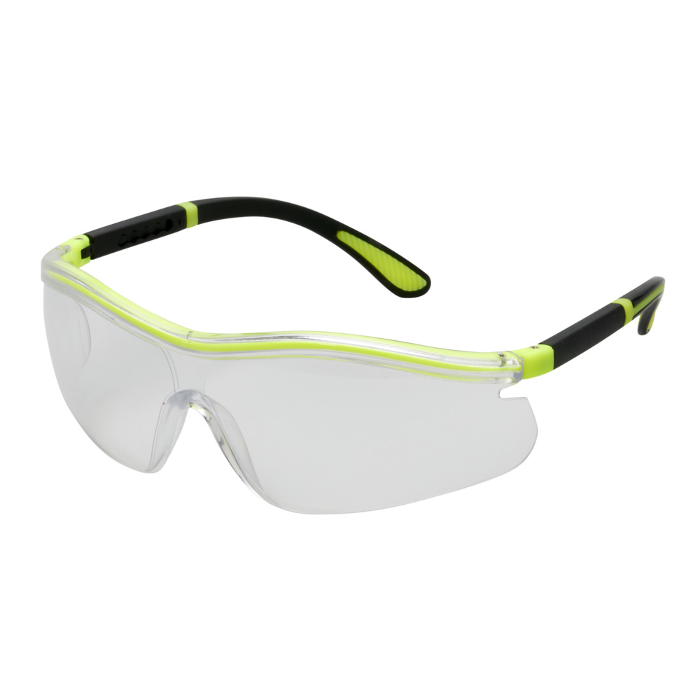 Schutzbrille optische Klasse I, sportliches Design mit hohem Tragekomfort, Bügel ist längenverstellbar, kratz- und beschlagfreie Beschichtung, Neonfarbe für gute Sichtbarkeit, UV Filter. Material: Nylon, PVC, Polycarbonat.