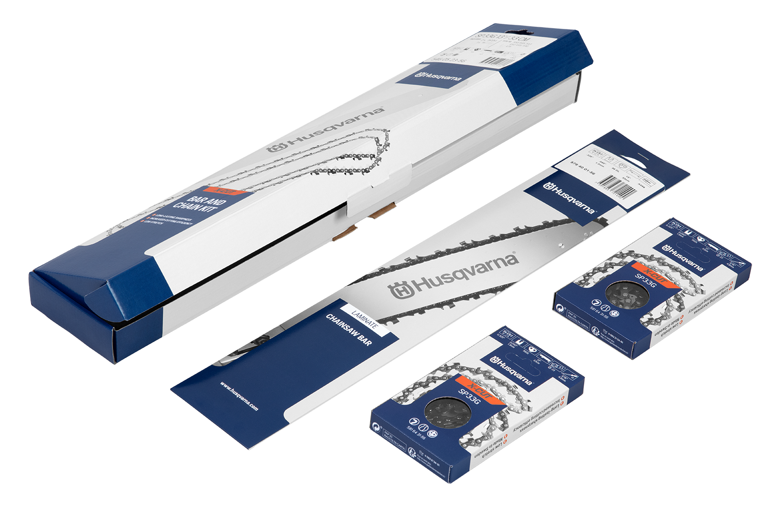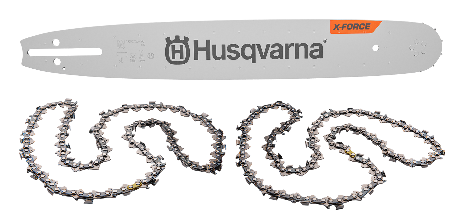 X-Force & SP33G Kit passend zu Husqvarna: passend zu Husqvarna: 543XP, 545XP Mark II, 550XP Mark II. Set bestehend aus einer Husqvarna X-Force Schiene und zwei Halbmeißel Sägeketten X-CUT SP33G.
