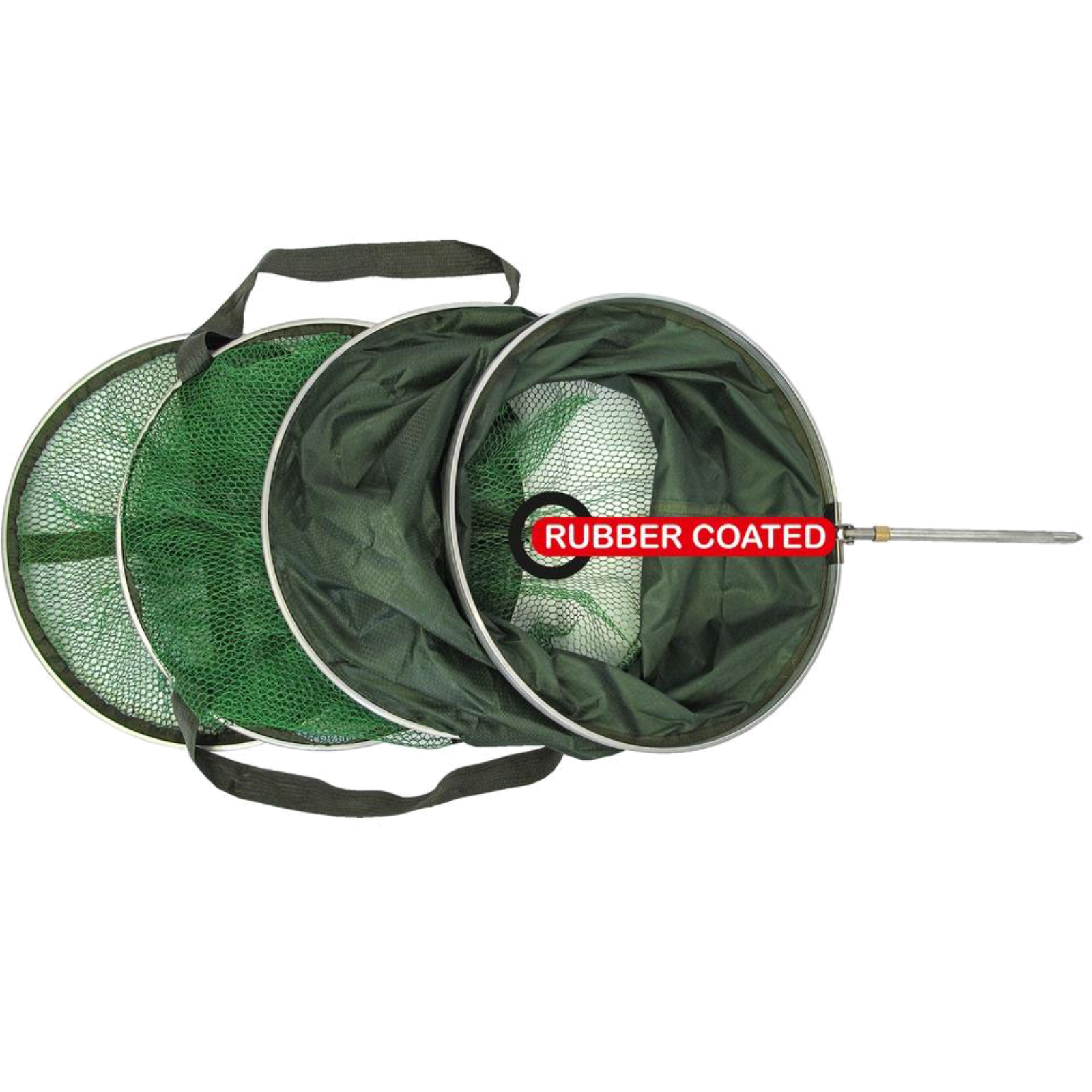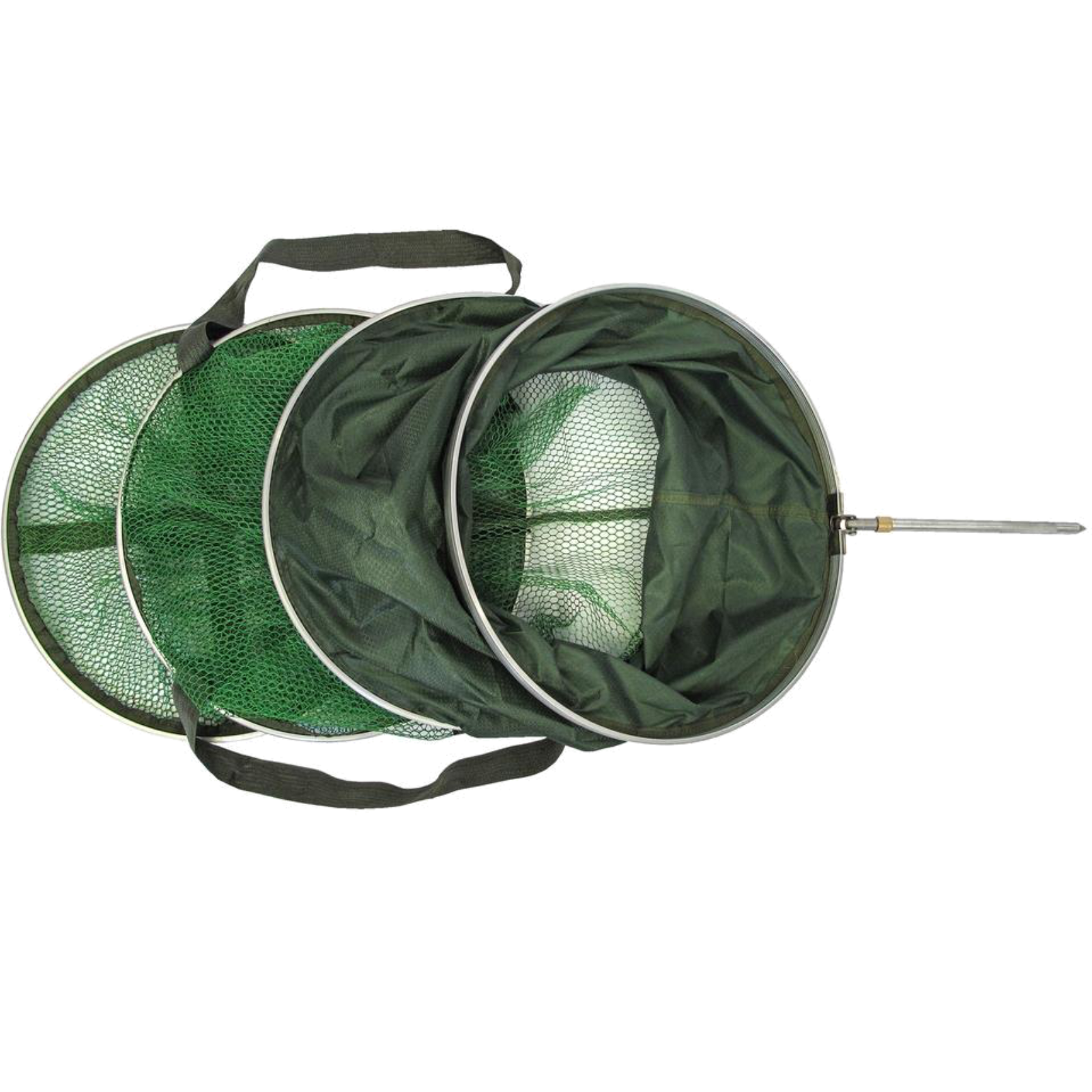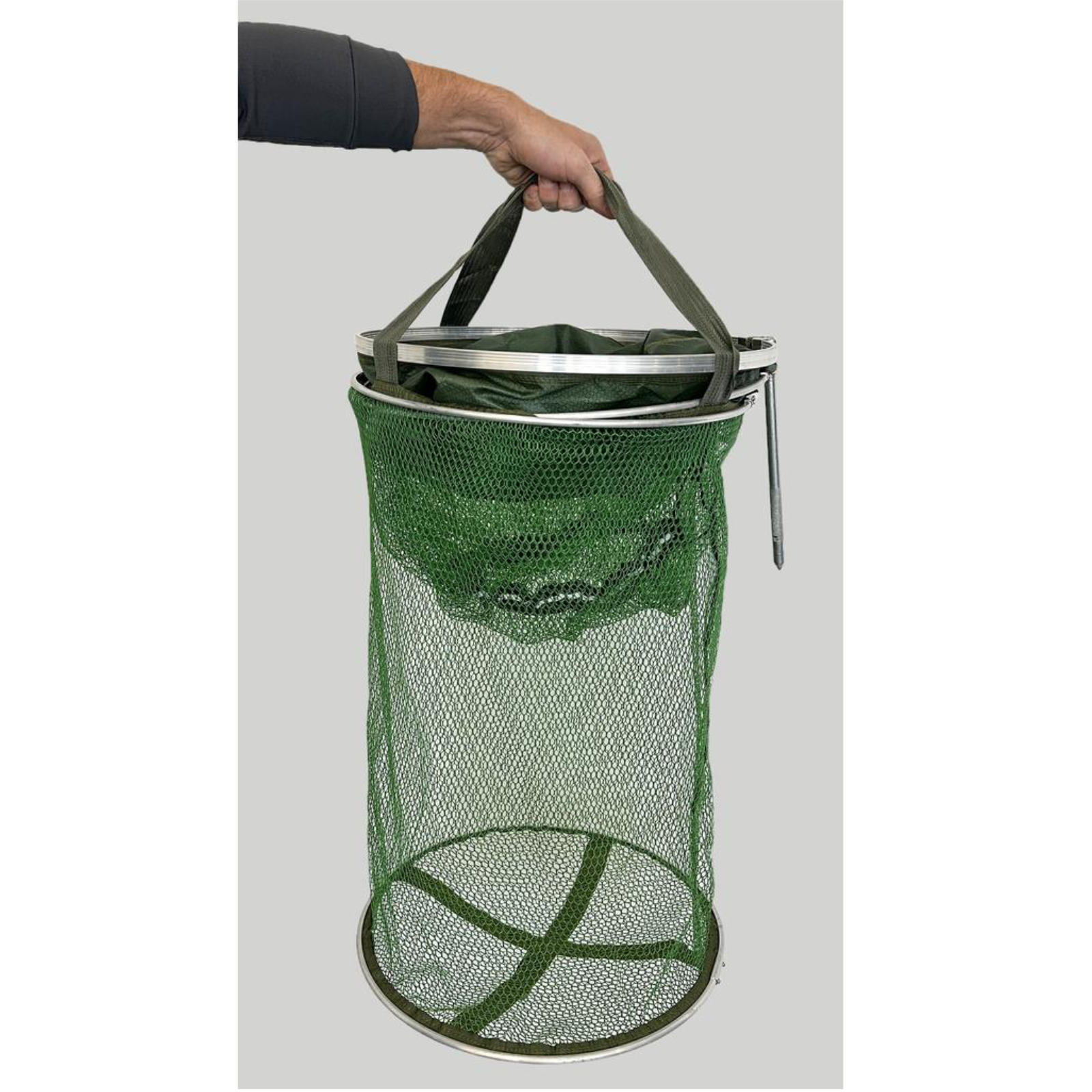 Gummierter Setzkescher – für sicheres und fischschonendes HälternDieser Setzkescher ist die ideale Wahl, wenn Sie Ihre Fänge lebend und stressfrei zwischenlagern möchten.Das gummierte Netz schont die Schleimhaut der Fische – ideal für verantwortungsbewusste Angler.Dank robuster Metallringe bleibt der Kescher formstabil, auch bei stärkerem Zug.Der integrierte Bankstick lässt sich einklappen, festschrauben und einfach am Ufer fixieren.Mit dem Kordelzug am oberen Rand können Sie den Kescher sicher verschließen.Besonders praktisch: Am untersten Ring befinden sich stabile Tragegriffe – für einfaches Entleeren oder Umsetzen.Nach dem Einsatz kann der Kescher bequem in der mitgelieferten Transporttasche verstaut werden.Top Qualität zum fairen Preis – ideal für Hobbyangler und Profis!Material: 100 % Polyester, gummiertLieferumfang: Setzkescher, Bankstick, TransporttascheLänge: 150 cm