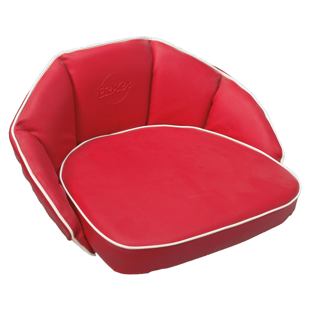 Rot, Lehnenhöhe 22 cm. Sitzfläche 44 x 42 cm, hochwertiger Kunstlederbezug, Polsterung und umlaufendes Gummiband zur Befestigung. Schriftzug passend zum Traktor/Schlepper eingeprägt.