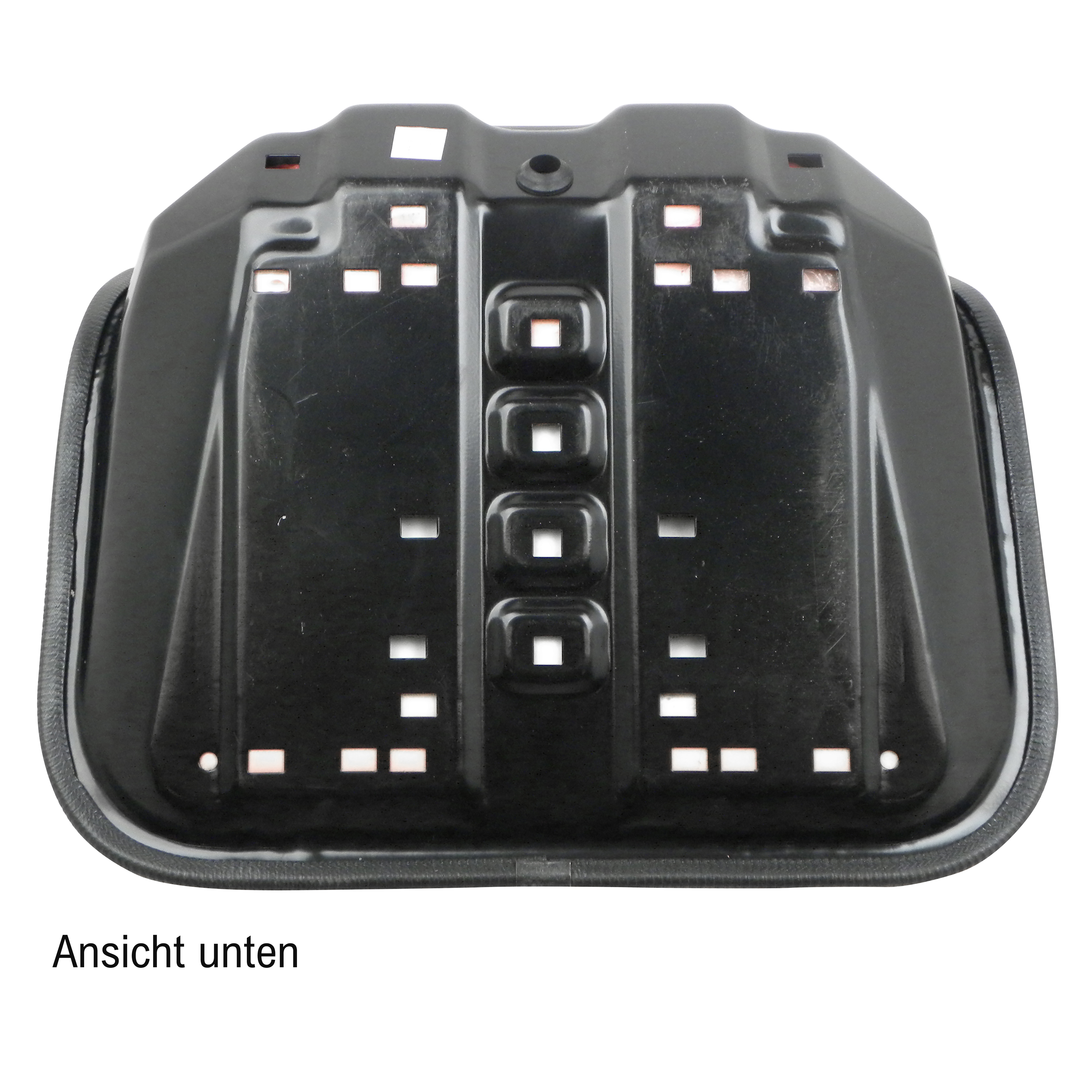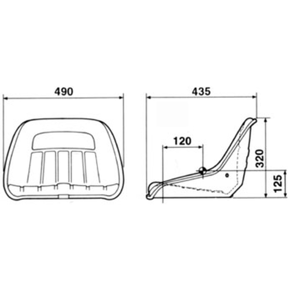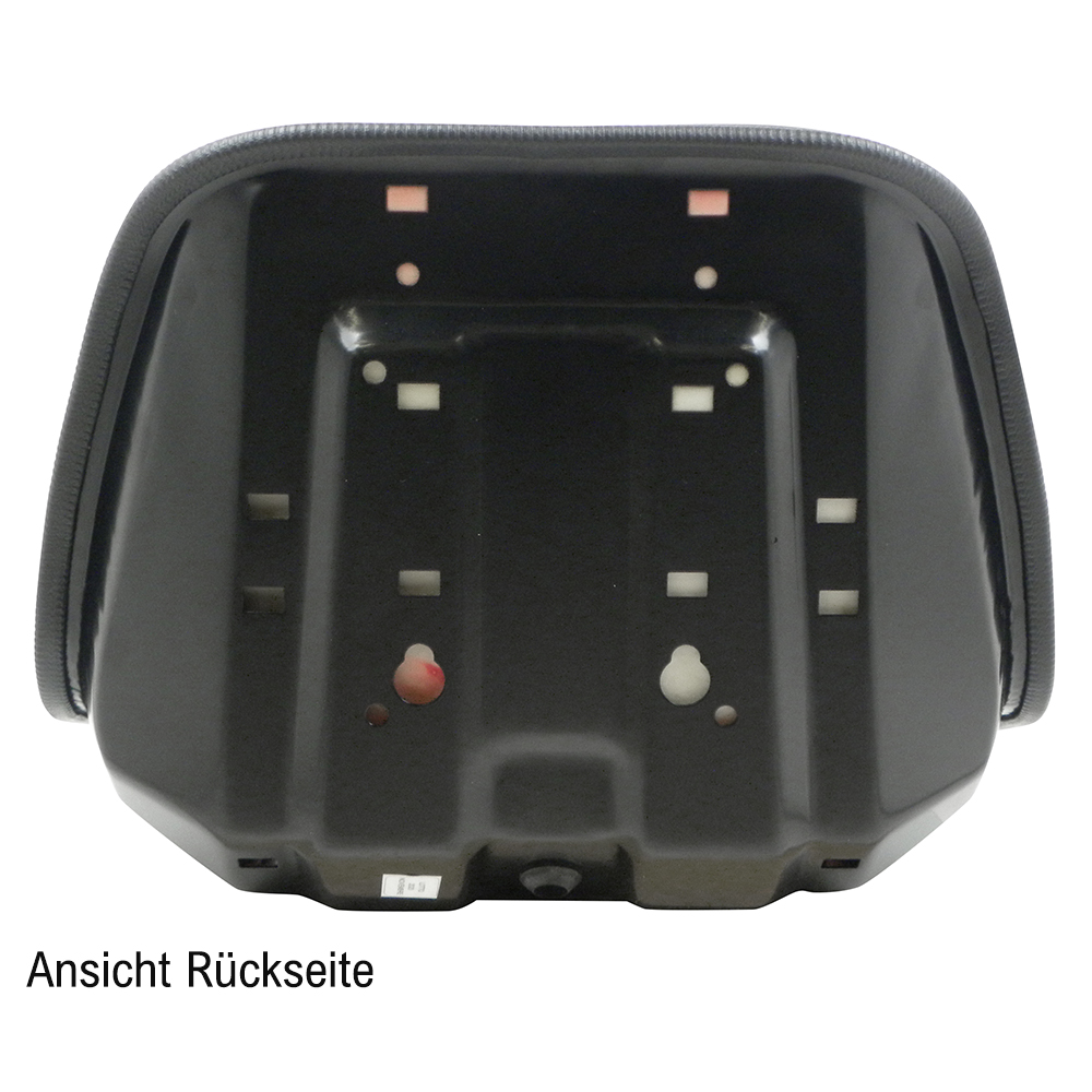 Sitzschale mit Stahlkonsole, Kunstlederbezug. Belüftungsrillen und Entwässerungslöcher, incl. 4 Fixiermuttern. Für z.B. Rasentraktore, Kehrmaschinen, Forst-, Ladekräne, etc. Maße BxTxH: 490 x 435 x 320 mm.