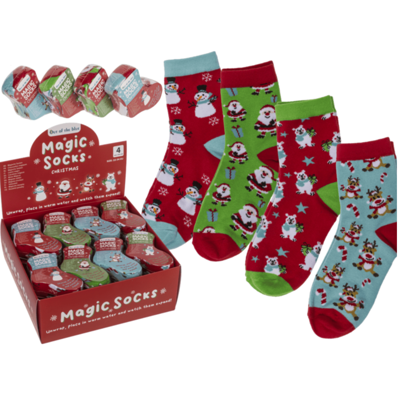 Einheitsgröße 22-34, Motive: Schneemann, Rentier, Weihnachtsmann und Eisbär- nicht frei wählbar, Socken ins Wasser legen und überraschen lassen! 72 % Baumwolle, 23 % Polyester und 5 % Elasthan.Magische Kindersocken sind ein faszinierendes Produkt, das Kindern eine zauberhafte Erfahrung bietet. Diese speziellen Socken sind mit niedlichen Weihnachts-Motiven versehen und haben eine einzigartige Eigenschaft. Sie sind in gepresstem Zustand, aber wenn sie mit Wasser in Berührung kommen, entfalten sie sich und zeigen ihre volle Pracht.Die Zaubersocken sind in sechs verschiedenen Motiven erhältlich:Schneemann, Rentier, Weihnachtsmann und Eisbär. Jedes Motiv ist liebevoll gestaltet und bringt die charakteristischen Merkmale des entsprechenden Tieres zum Ausdruck. Kinder werden begeistert sein, wenn sie sehen, wie sich die Socken langsam entfalten und die Motive zum Vorschein kommen.Die Socken haben eine Einheitsgröße von 22 bis 34, was bedeutet, dass sie für Kinderfüße in diesem Größenbereich geeignet sind. Das elastische Material besteht aus 72 % Baumwolle, 23 % Polyester und 5 % Elasthan. Dies sorgt für ein angenehmes Tragegefühl und eine gute Passform.Um die magische Entfaltung zu erleben, müssen die Kindersocken einfach ins Wasser getaucht werden. Sobald sie mit dem Wasser in Berührung kommen, beginnen sie sich aus zu breiten und das niedliche Weihnachts-Motiv zu enthüllen.Diese Verwandlung wird Kindern Freude bereiten und ihnen eine magische Erfahrung bieten.Magische Zaubersocken mit Weihnachts-Motiven sind nicht nur ein lustiges Accessoire, sondern auch ein originelles Geschenk für Kinder.MOTIV NICHT FREI WÄHLBAR