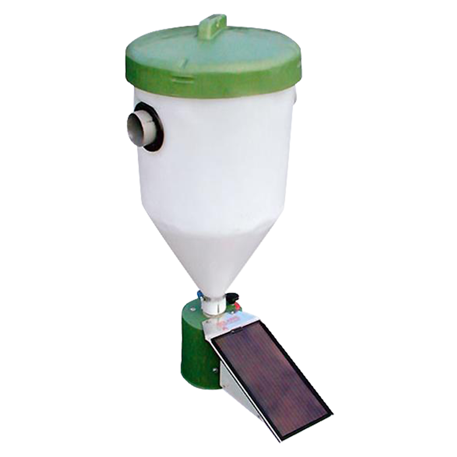 Solarbetriebener FutterautomatZuverlässige Fütterung – unabhängig vom Stromnetz!Dieser solarbetriebene Futterautomat steht seit über 25 Jahren für erstklassige Qualität und außergewöhnliche Langlebigkeit.Mit seinem leistungsfähigen Rund- und Sektorstreuer eignet er sich hervorragend für den Einsatz in der professionellen Fischzucht ebenso wie im Garten- und Hobbyteichbereich.Wo kein Stromanschluss vorhanden ist, sorgt dieser Automat für eine zeitgesteuerte, automatische Futterausgabe – und das vollkommen unabhängig vom Netzbetrieb.Die Streuweite beträgt 6–8 Meter, wodurch Flächen von ca. 36–64 m² zuverlässig mit Futter abgedeckt werden können.Lieferumfang (einsatzbereit):Solarmodul zur autarken EnergieversorgungRobuster Futterbehälter mit Deckel (Grün)Rohrdurchführung für einfache MontageVorteile auf einen Blick:Autark & umweltfreundlich: Keine externe Stromquelle notwendigVielseitig einsetzbar: Perfekt für Fischzuchtanlagen, Koiteiche oder abgelegene TeichsystemeEffiziente Verteilung: Rund- oder Sektorstreuung mit großer ReichweiteRobustes Design: Für den langfristigen Außeneinsatz konstruiert