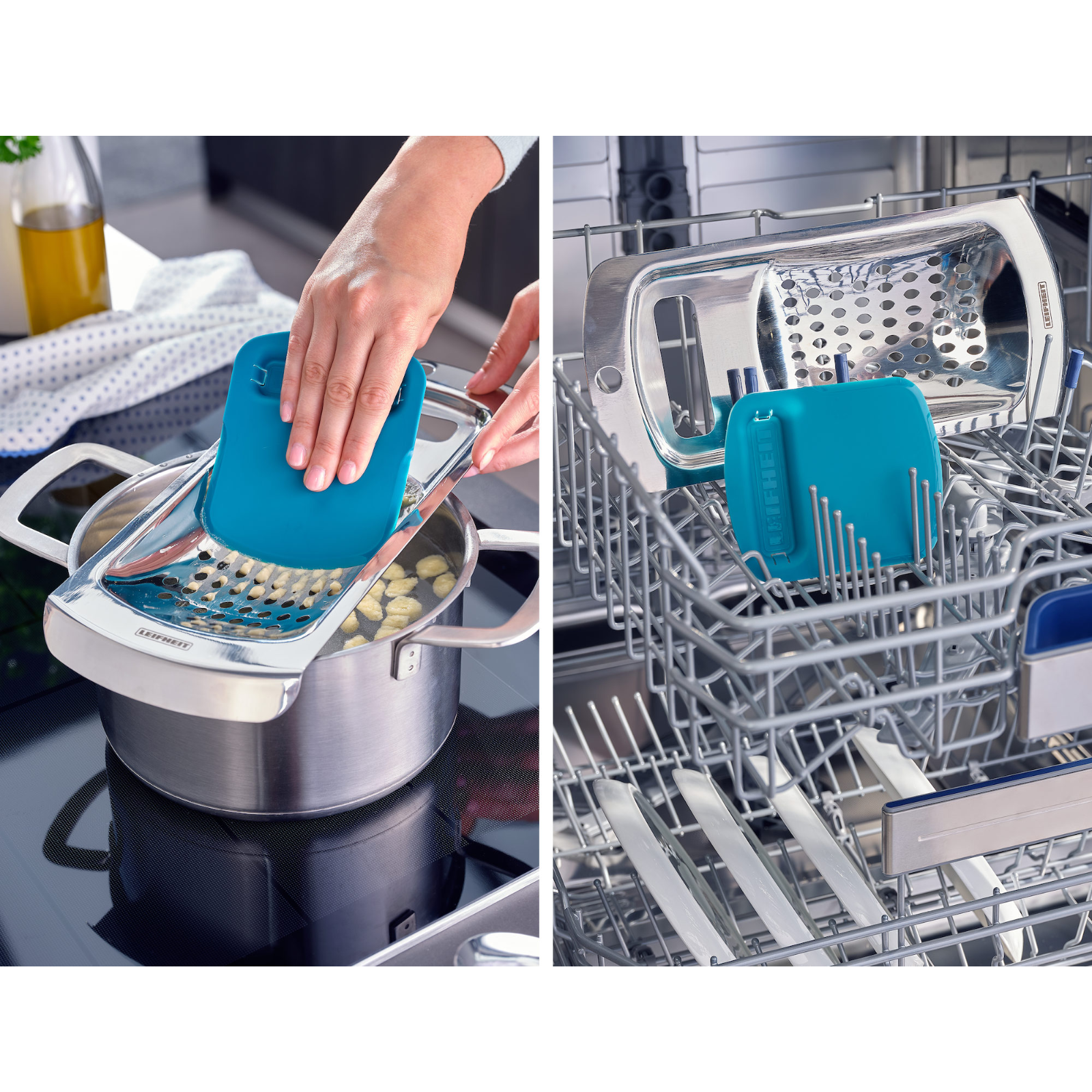 Leckere Spätzle ohne lästiges Kleckern in der Küche zubereiten.Die Schaber-Technik bietet viele Vorteile gegenüber anderen Methoden zur Spätzle-Herstellung:Der Teig läuft nicht über den Rand wie bei Spätzlereiben oder -hobeln.Auch beim Befüllen gibt es kein Kleckern, wie es oft bei Spätzlepressen mit engen Öffnungen der Fall ist.Der Spätzleschaber sorgt für sauberes und tropffreies Arbeiten.Der Kunststoffschaber ist ergonomisch und flexibel, was das Verstreichen des Spätzleteigs ohne großen Kraftaufwand ermöglicht.Dank seines einfachen Aufbaus aus wenigen Teilen ist er leicht zu reinigen – von Hand oder in der Spülmaschine.Ein zweiter Ersatzschaber ist im Lieferumfang enthalten.Der Spätzleabstreifer besteht aus hochwertigem, robustem und rostfreiem Edelstahl, was es formstabil und widerstandsfähig gegen heißen Wasserdampf macht.Besonders praktisch ist die Einklick-Funktion, mit der der Schaber an der Reibe befestigt werden kann, sodass er immer griffbereit ist.Zudem verfügt der Nockerlschaber über eine Aufhängeöse, sodass es problemlos an einer Hakenleiste aufgehängt werden kann.Maße: ca. 37 x 15,5 x 4,5 cm.