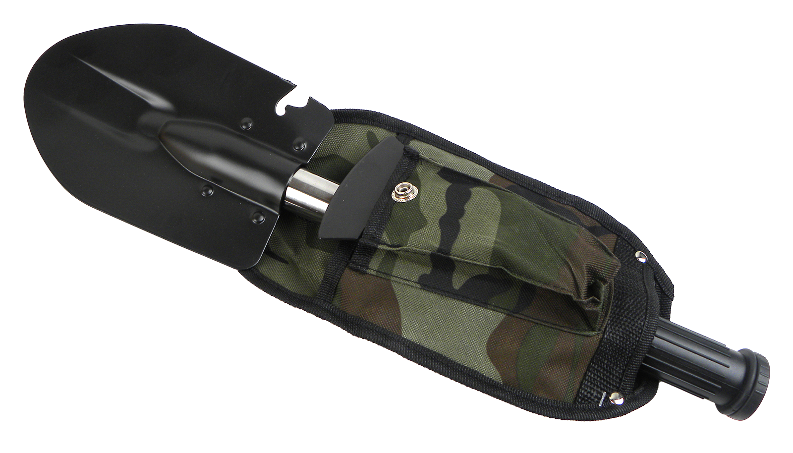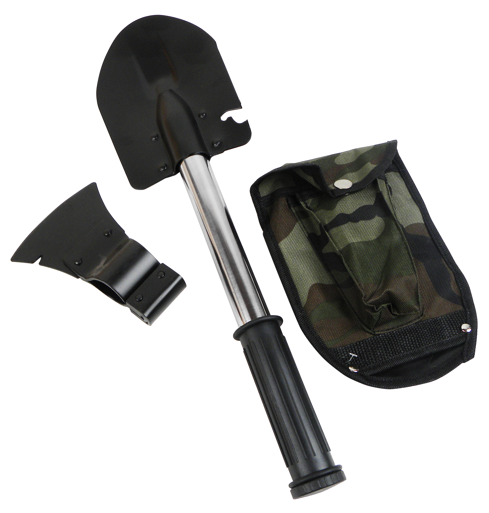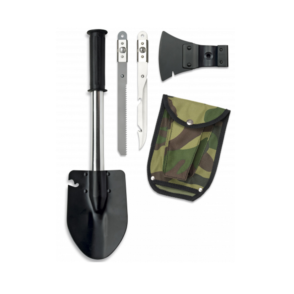 Spaten mit Axt, mit Hammerfläche, mit Säge, Inkl. Nylon Tasche im Camo Design, Messer und Säge im Handrohr untergebracht - ein Teil von vorne und ein Teil hinten zum Herausziehen. Gesamtlänge: 42 cm, Gewicht: ca. 340 g.