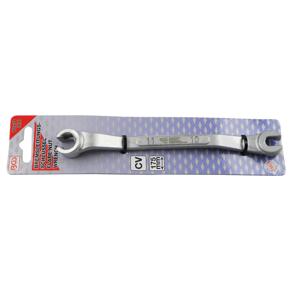 Verchromter Spezial Bremsleitungsschlüssel mit hinterlegten, verstärkten Sechskantöffnungen und doppelt gekröpft. Länge 175 mm, Schlüsselweiten 10 mm und 11 mm.