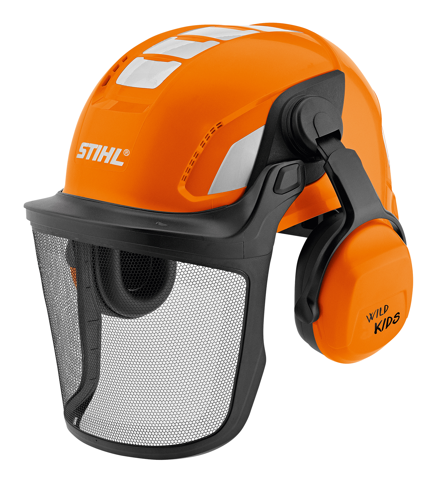 Originalgetreue Nachbildung des STIHL Profihelms, ABS-Kunststoff, klappbares Visier, verstellbare Größe, anklappbarer Ohrschutz, keine Schutzfunktion, für Kinder ab 3 Jahren geeignet.