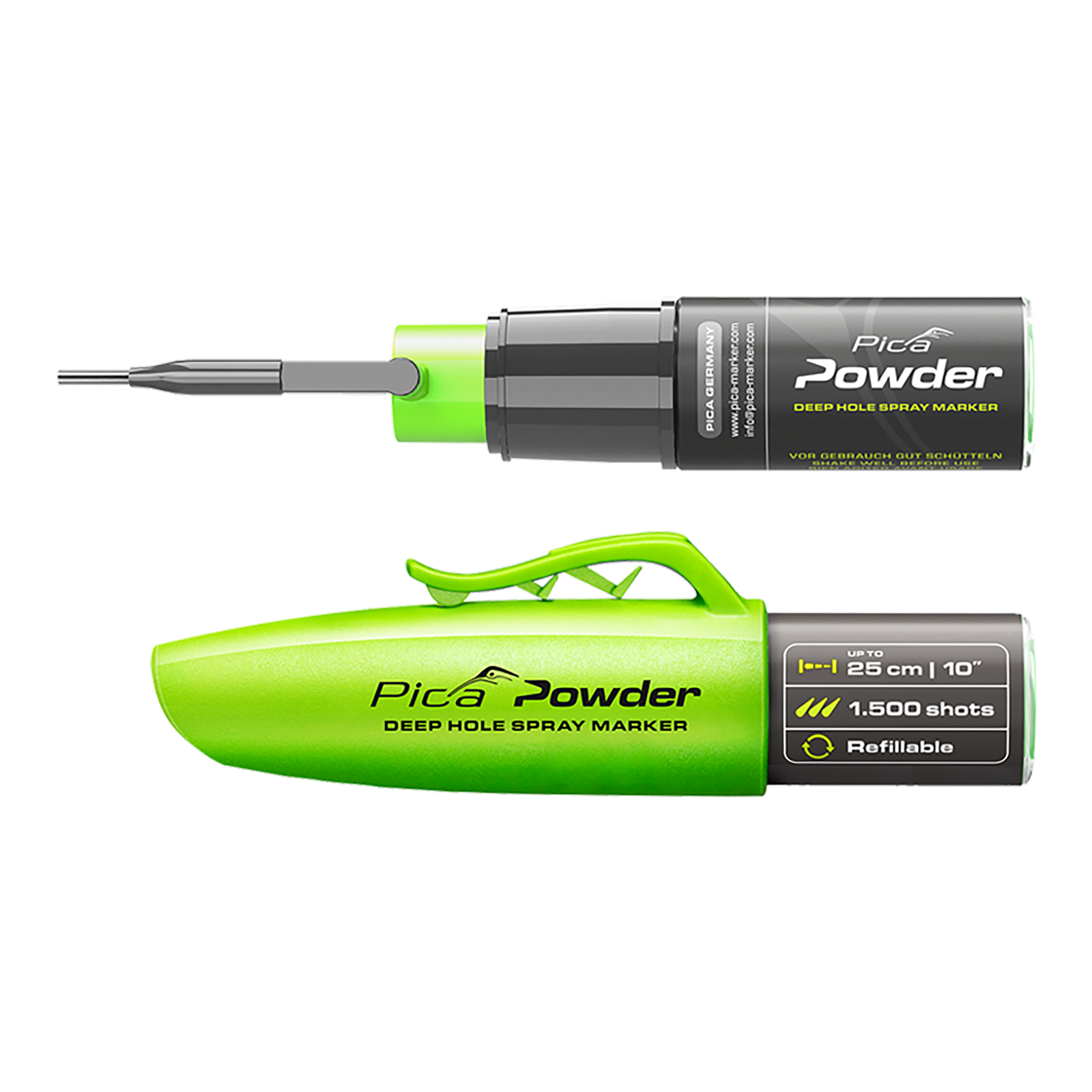 Kleines Werkzeug - große Hilfe bei Markieren von Bohrlöcher. Der Pica Spraymarker verfügt über einen feinen 360° Sprüharm mit der Sie problemlos auch schwer zugängliche Stellen erreichen.Der spezielle Sprühkopf funktioniert in jeder Position und bis zu 1.500 Schuss. Sprüht problemlos in Bohrlöcher bis 25cm und ab 3mm Bohrlochgröße.Das grüne, fluoreszierende Kreidepulver haftet an praktisch allen Oberflächen. Durch die kompakten Maße von nur 35x129x38mm überall einsetzbar.