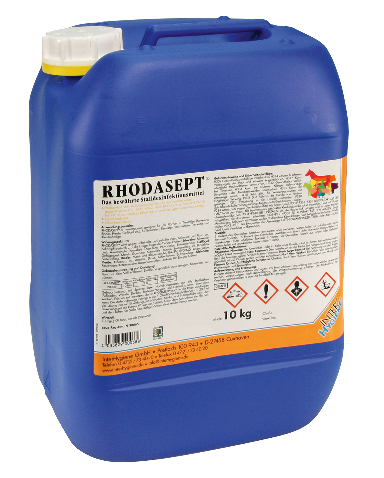 Hochwirksames Desinfektionsmittel für Flächen in der Nutztierhaltung, Tierarztpraxen, Kleintierställen- und käfigen sowie zum Einsatz in Desinfektionswannen und -matten. Kann mittels Tuch aufgetragen oder gesprüht werden. Wirksam gegen behüllte und unbehüllte Viren, Mykoplasmen, Bakterien (inkl. Salmonellen) und Pilze. Geruchsreduziert und Formaldehydfrei! Anwendungskonzentration 1-4 %. Wirkstoff Glutaral.. Kanister 10 Liter.