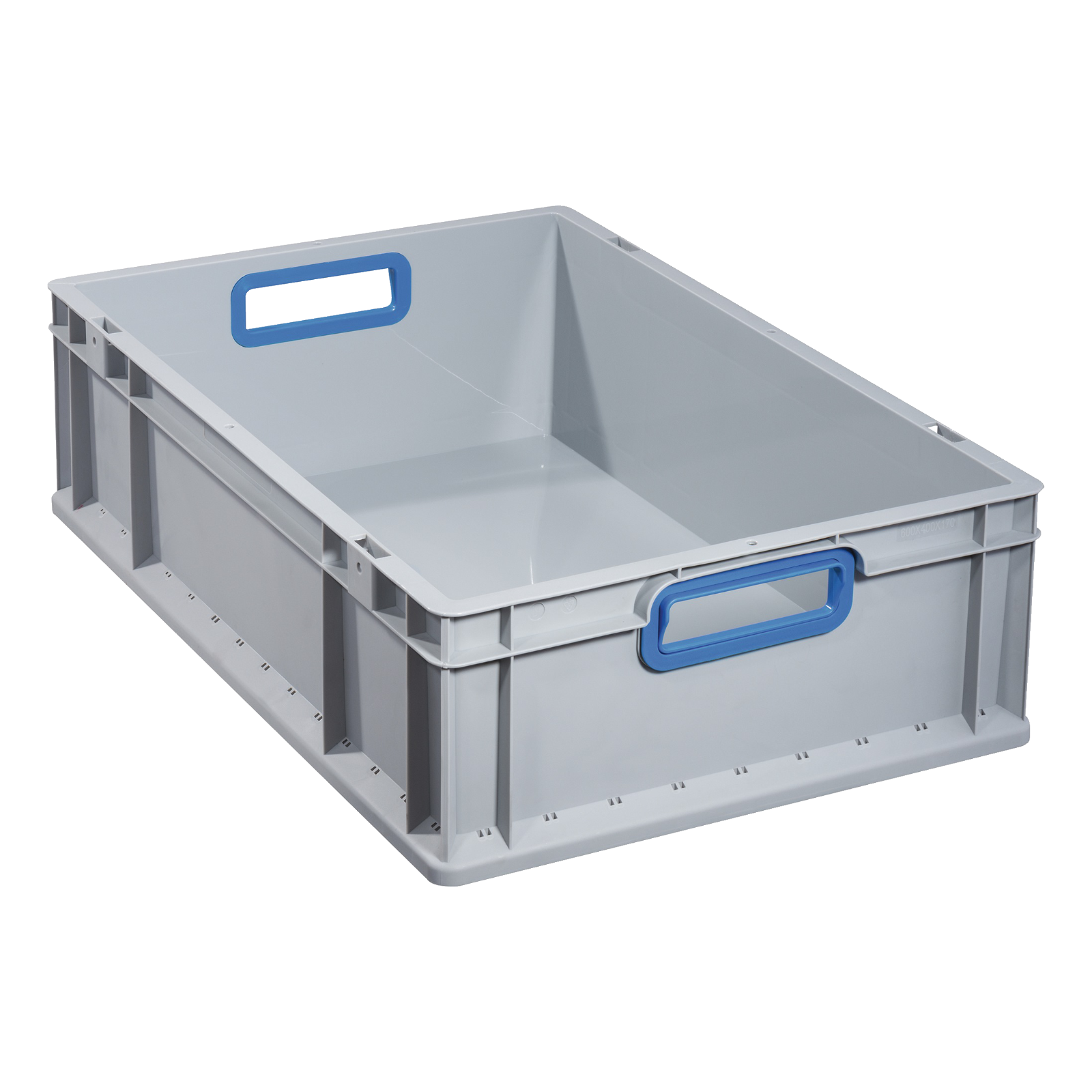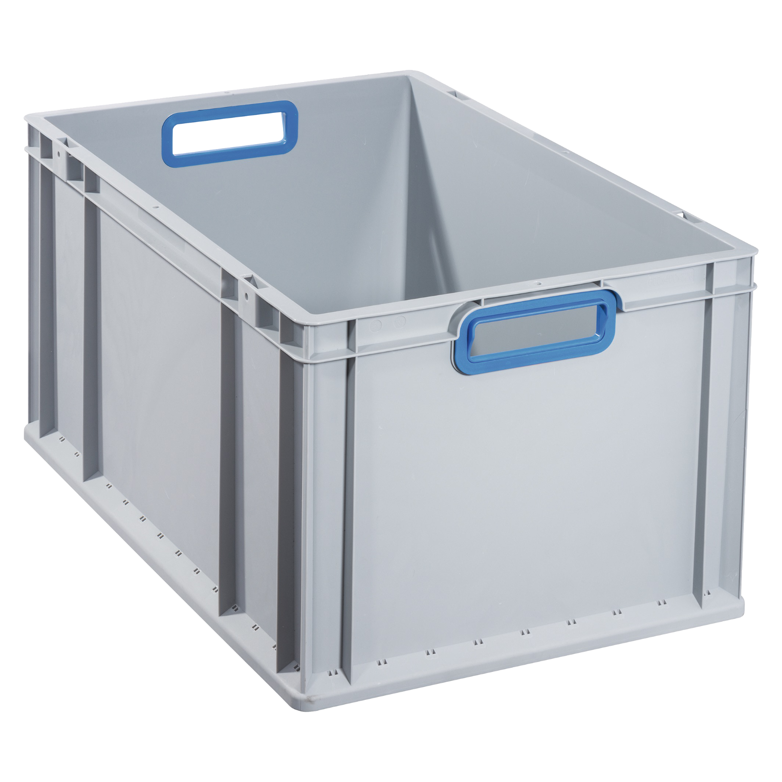 Graue ​Normkisten, Grundmaß 60x40 cm, tolle Behälter mit Durchfassgriff blau, für einen vielseitigen Einsatz im Lager- und Kommissionierbereich, aber auch im privaten Haushaltoptimale Reinigung durch glatte Innenwände, selbstzentrierender umlaufender Stapelrand,abgestimmt auf Europalettenmaße, resistent gegen die meisten Säuren und Öle,temperaturbeständig von -10° bis + 60°Boden und Seitenwände geschlossen