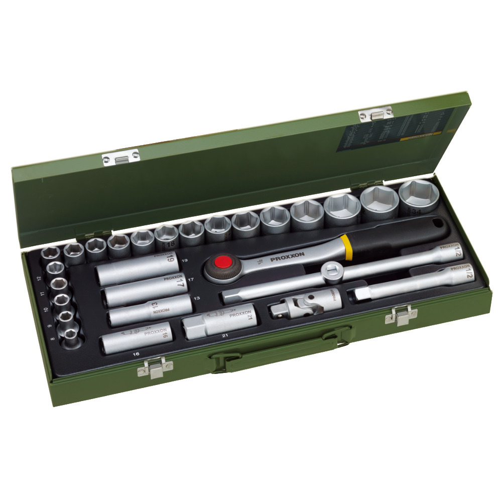 29-tlg. Werkzeugsatz in hochwertiger Ausführung. Nussen von 8-34 mm, inkl. Zündkerzeneinsätze 16 und 21 mm. Ideal für den kraftvollen Einsatz. In Stahlkassette.