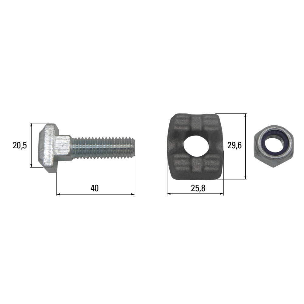 Steckschraubengarnitur M10x40 passend zu Kratzbodenkette 8x31, 9x31. Die Kettenschraubengarnitur besteht aus Kettenschraube, Druckstück und Sicherungsmutter.