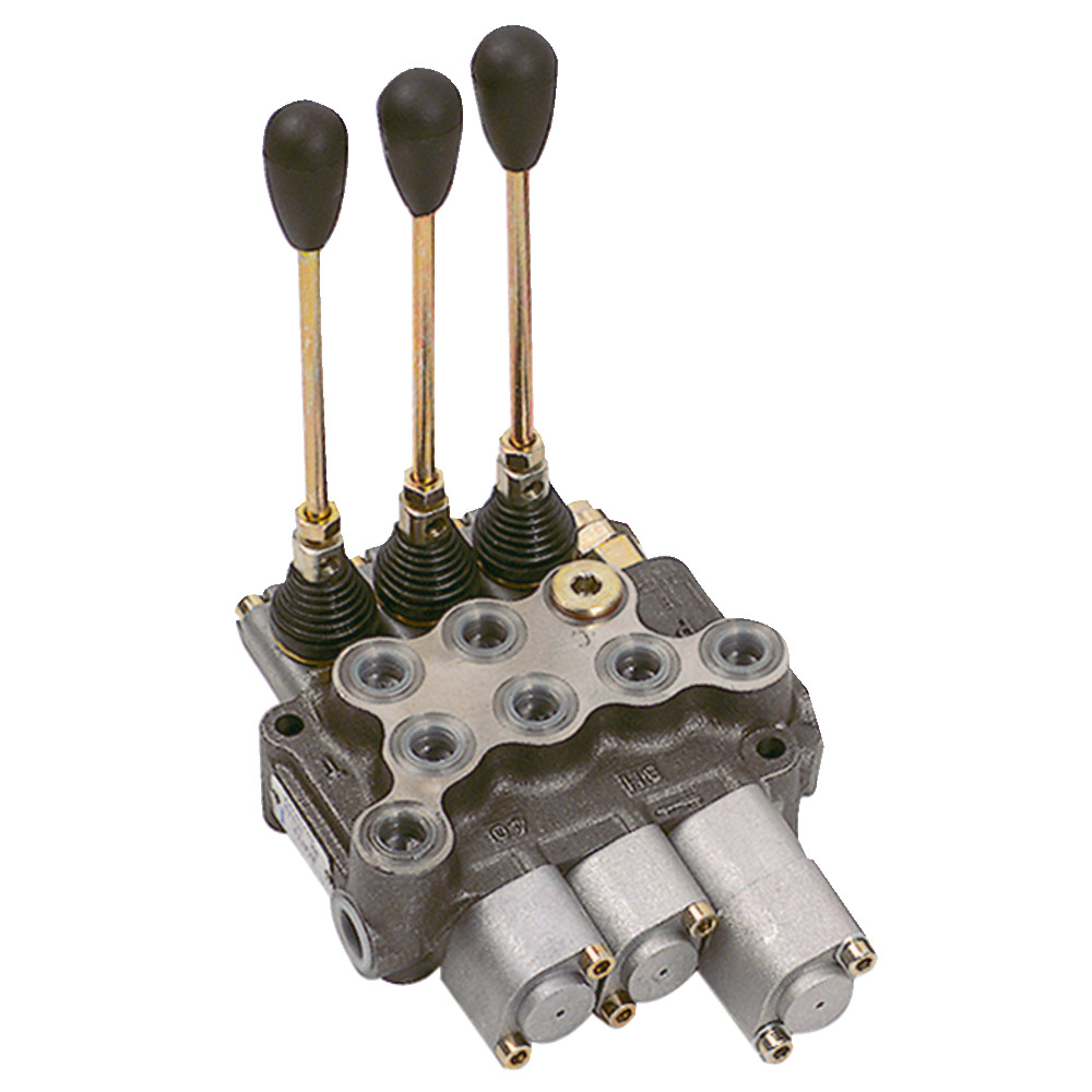 Mechanische Betätigung mit Federrückstellung in Standardausführung. Die Mittelstellung ist mit einem drucklosen Umlauf ausgeführt und die Anschlüsse A, B sind gesperrt. Druckbegrenzungsventil am Anschluss P (Pumpe). Negative Überdeckung der Schieber.Standardausführung der Ventile in Parallelschaltung. Durchfluss max.: 45 L/min. Betriebsdruck: 250 bar max. Druck: 320 barÜberdruckventil eingestellt: 140 bar, einstellbar von 100-250 barEinschraubgewinde A, B, P, T,: R3/8"Einschraubgewinde P2, T2: R1/2"H=Heben, 0=Mittelstellung, S=Senken, SW=Schwimmstellung, ELG=Eilgang, R=mit Raste.Die angeführten Schaltstellungen sind vom jeweiligen Modell des Steuerventils abhängig.