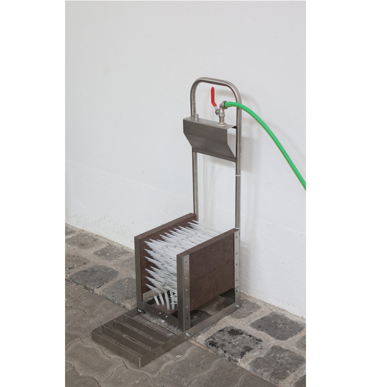Wasseranschluss 1/2 Zoll (Kugelhahn mit Tülle). Rutsch- und trittsicher, komplett mit 5 Bürsten und Abklopfrost. Robuste Edelstahlausführung, mühelose Reinigung mit Wasser.