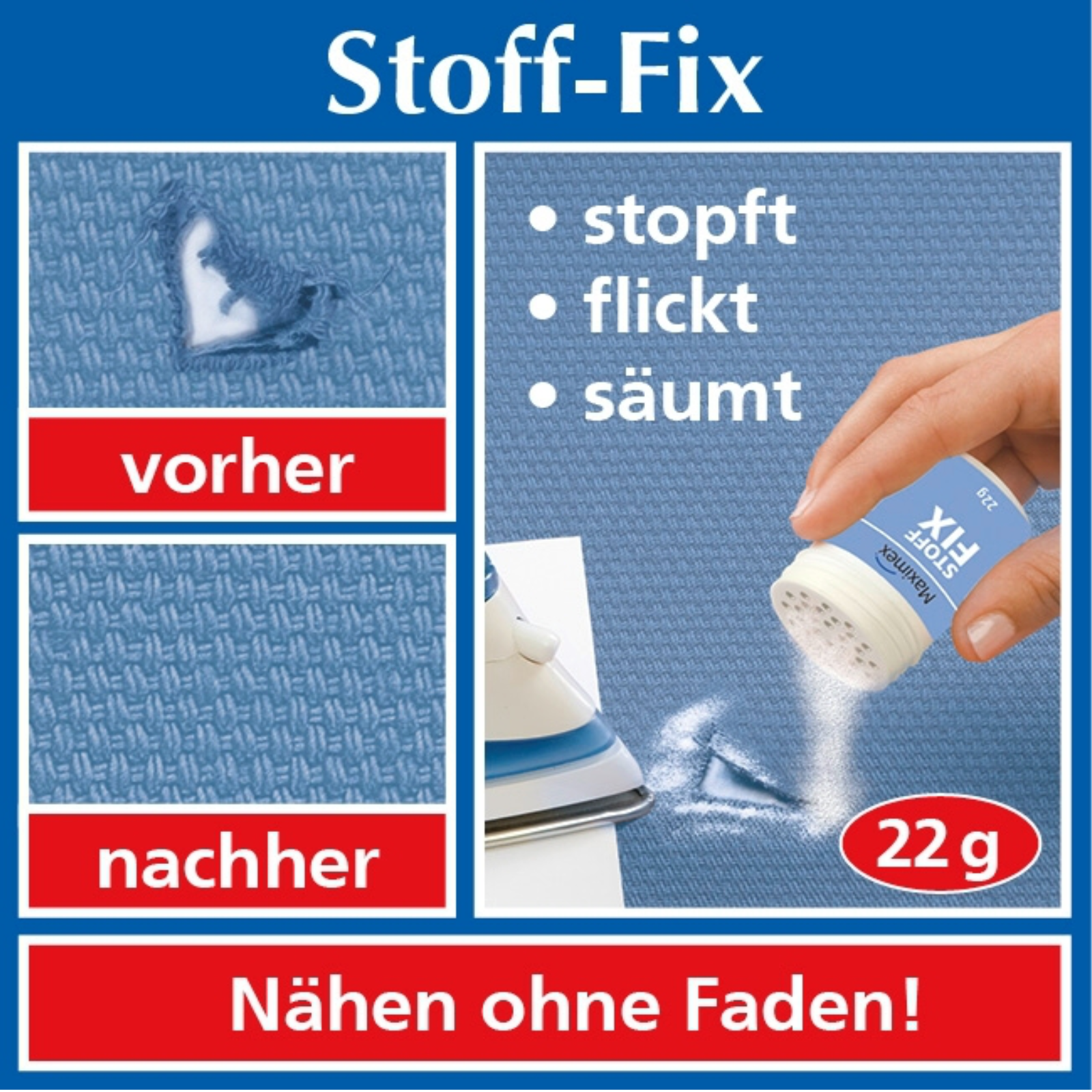 Einfach aufstreuen, bügeln - fertigOhne Nadel und Faden verwenden zu müssen, können Sie säumen, flicken und stopfen,eine schnelle, saubere und preiswerte Lösung.Wasch- und reinigungsbeständig.made in GermanyInhalt: 22 g Granulat