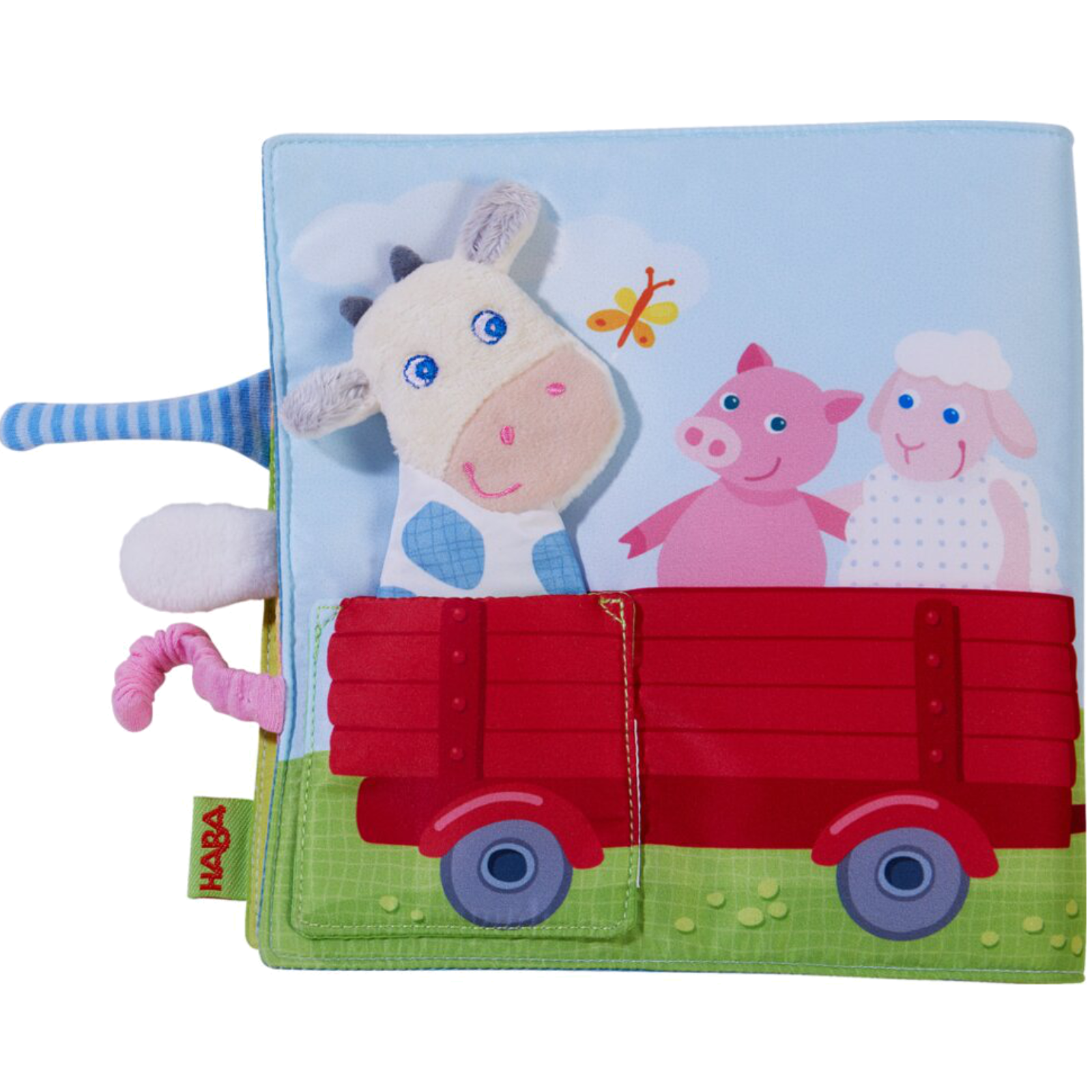 Am Bauernhof gibt es viel zu Entdecken! Und genau dorthin geht es mit dem weichen Stoffbuch, das bereits die Jüngsten zum Schauen, Fühlen, Spielen und (Be-)Greifen einlädt. Nicht fehlen darf die Kuh: Sie ist als Fingerpuppe auf dem Bauernhof unterwegs und erlebt viele lustige Abenteuer. Dabei trifft sie auch andere Hoftiere. Mit Klappen, Quietsche und Spiegelfolie gibt es für Babys eine Menge zu entdecken. Die vielen Fühl- und Spielelementen des farbenfrohen HABA Stoffbuchs machen die „Lektüre“ besonders spannend und sorgen immer für gute Unterhaltung.Das ideale Babyspielzeug mit 6 weichen Seiten aus Polyester, welche sich von kleinen Händen gut greifen und umblättern lassenDieses Buch bietet eine Menge Überraschungen: Klappen, Spiegelfolie, Fühlelemente, Quietschen und viele DetailsDie Kuh-Fingerpuppe begleitet Kleinkinder durch das Soft-Bilderbuch, regt zum Erzählen von Geschichten und zu ersten Rollenspielen anMit vielen Elementen zum Greifen, Schauen, Fühlen und Hören fördert das Softbuch Babys in ihrer motorischen und sensorischen Entwicklungfür Babys ab 6 Monaten