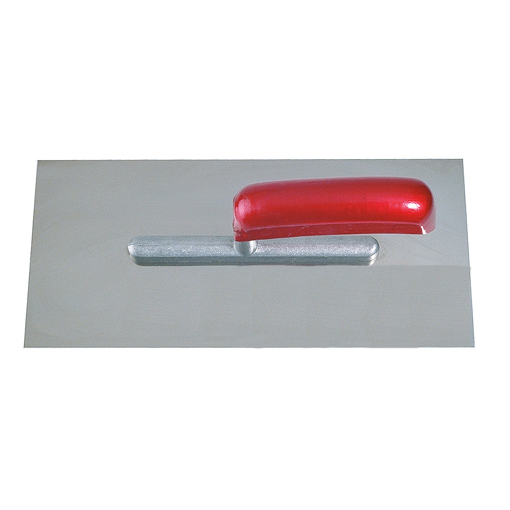 Glättekelle rostfrei, Blatt aus federhartem Edelstahl, rostfrei, langer, Alu-Steg, gebogenes rotmetallic Heft, Maße: 280x130x0,75 mm.