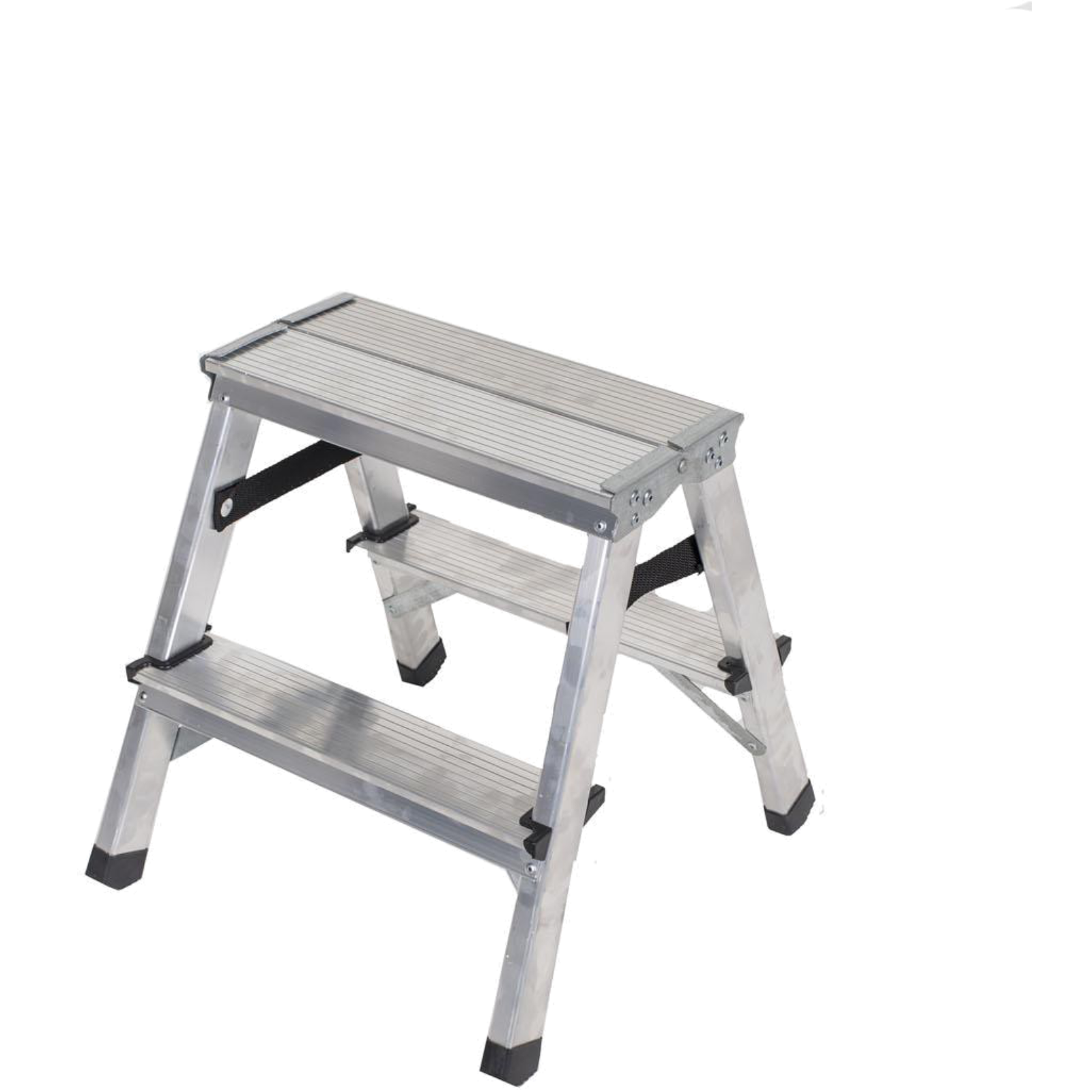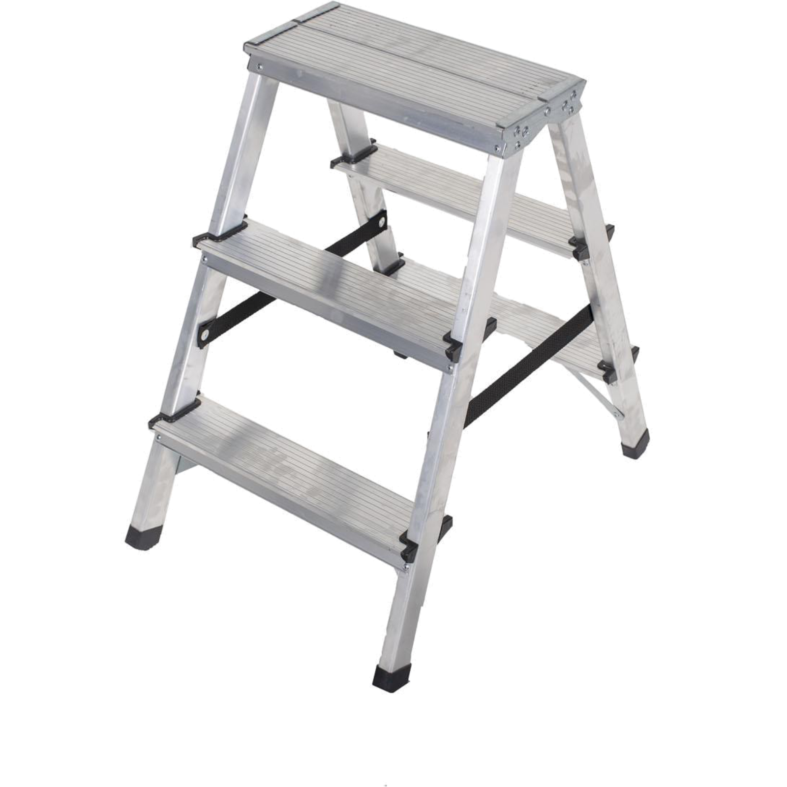 Die zweiseitig begehbare Stufenleiter vereint Sicherheit, Stabilität und Benutzerfreundlichkeit in einem. Belastbarkeit bis 150kg.