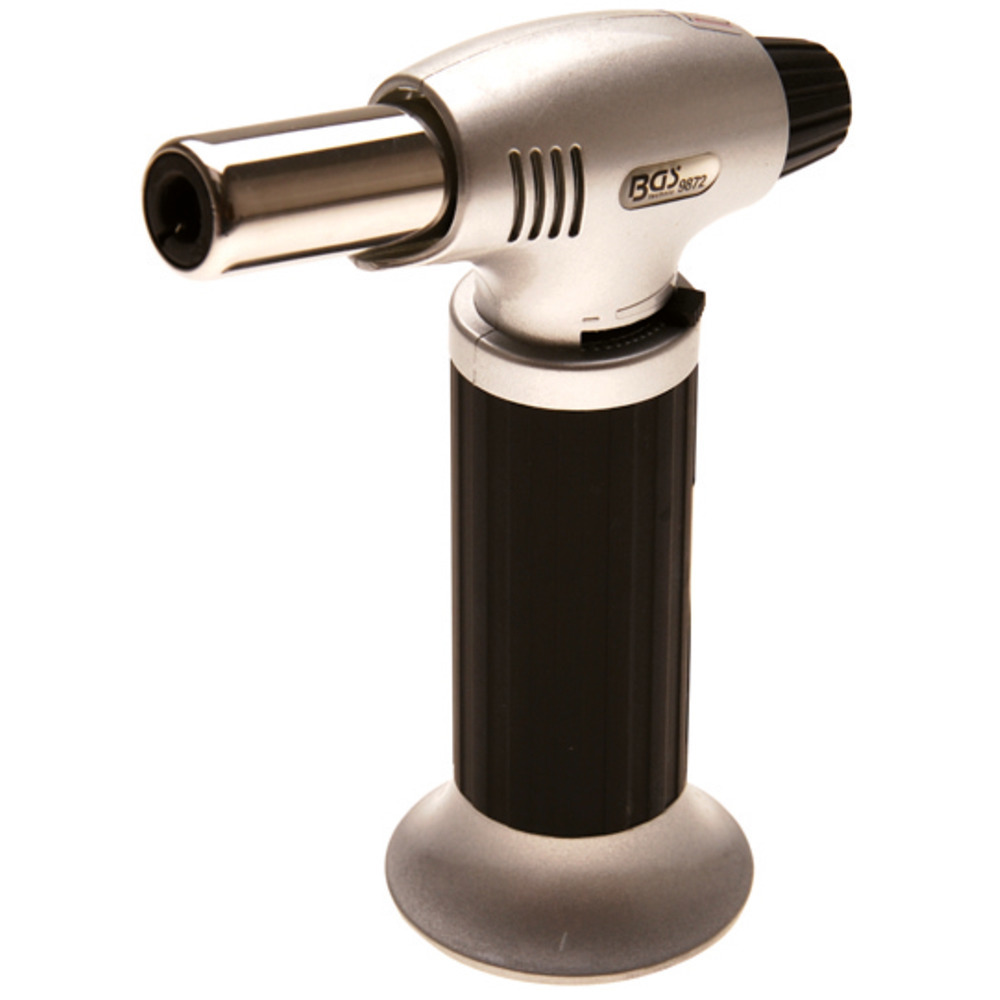 Ausführung mit sicherem Piezo Zündung, Sperrschalter und Regler zum Einstellen der Flammengröße.Die Befüllung erfolgt mit herkömmlichem Feuerzeuggas.