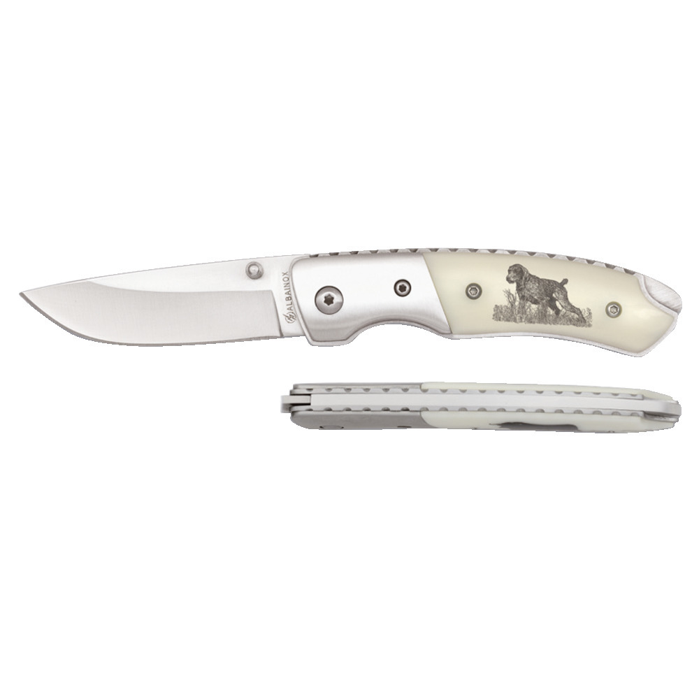Formschönes Taschenmesser aus 440A Stahl- Rostfrei. Klingenlänge 6,5 cm, Zwinge aus Edelstahl. Griff ABS mit Hundemotiv. Aufgeklappt ist das Messer 17 cm lang.