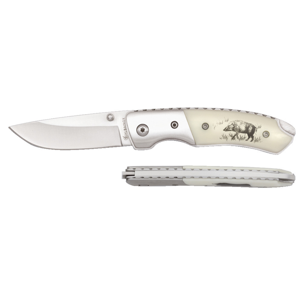 Formschönes Taschenmesser aus 440A Stahl- Rostfrei. Klingenlänge 6,5 cm, Zwinge aus Edelstahl. Griff ABS mit Wildschweinmotiv. Aufgeklappt ist das Messer 17 cm lang.