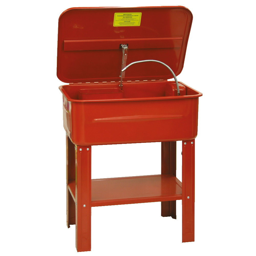 Robuster Teilewascher mit klapparen Deckel. Wannengröße ca.75x50 cm. Füllinhalt ca. 20 Liter. Mit elektrischer Reinigungsmittelpumpe.
