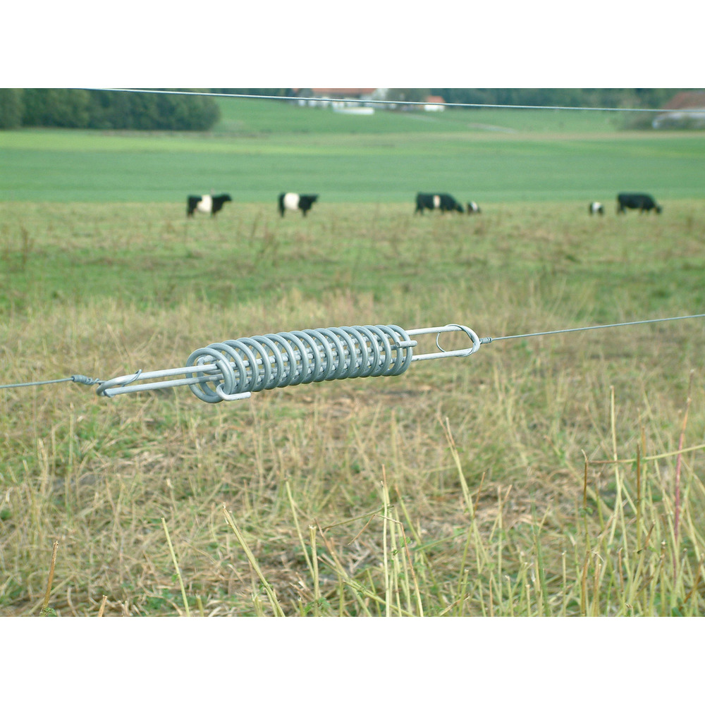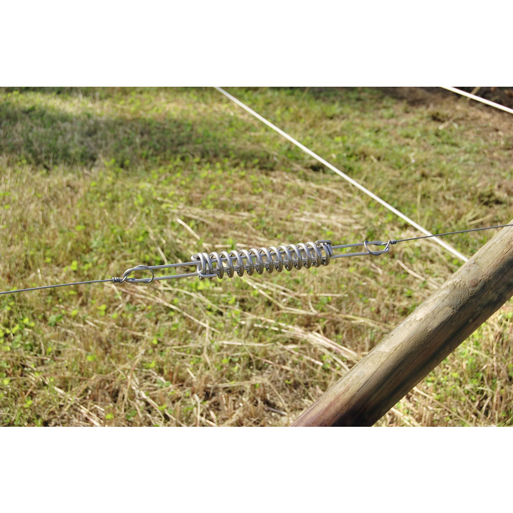 Stabile Ausführung für Stahldraht bis 2,5 mm. Bewirkt eine Entspannung im Draht und bei den Eckpfosten, gleicht Temperaturschwankungen aus und macht den Zaun elastisch.Aus Edelstahl. Länge: 43,5 cm; Ø Feder: 43 mm