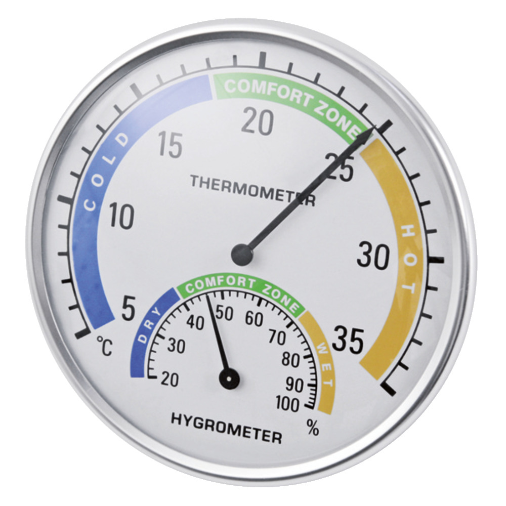 Zur Messung der Temperatur und der Luftfeuchtigkeit. Ø 130 mm, Tiefe 32 mm.Zum Aufhängen oder Aufstellen.