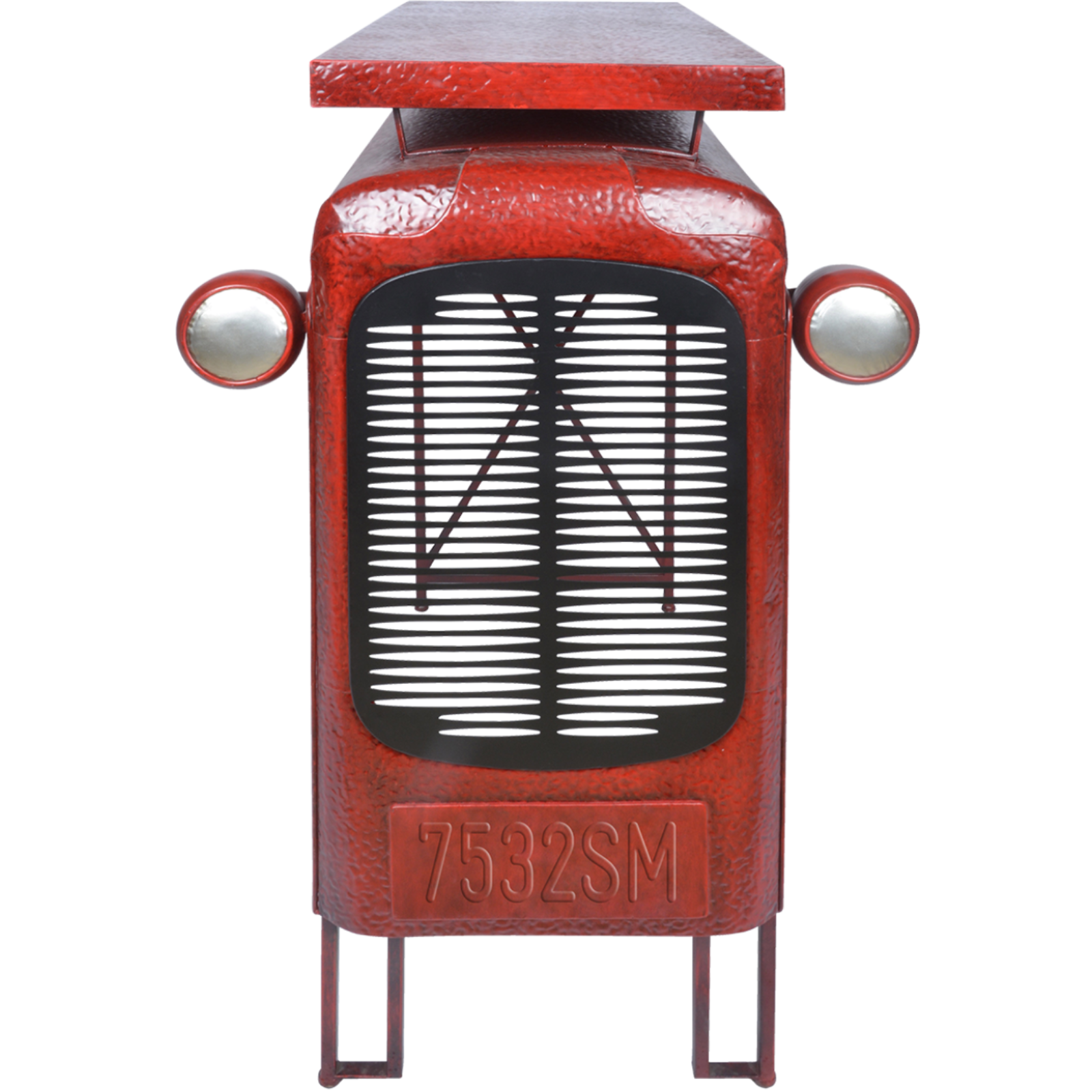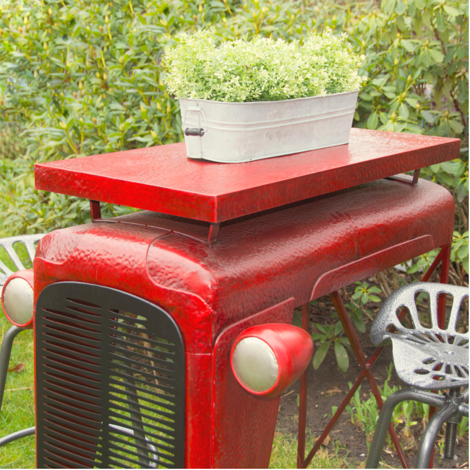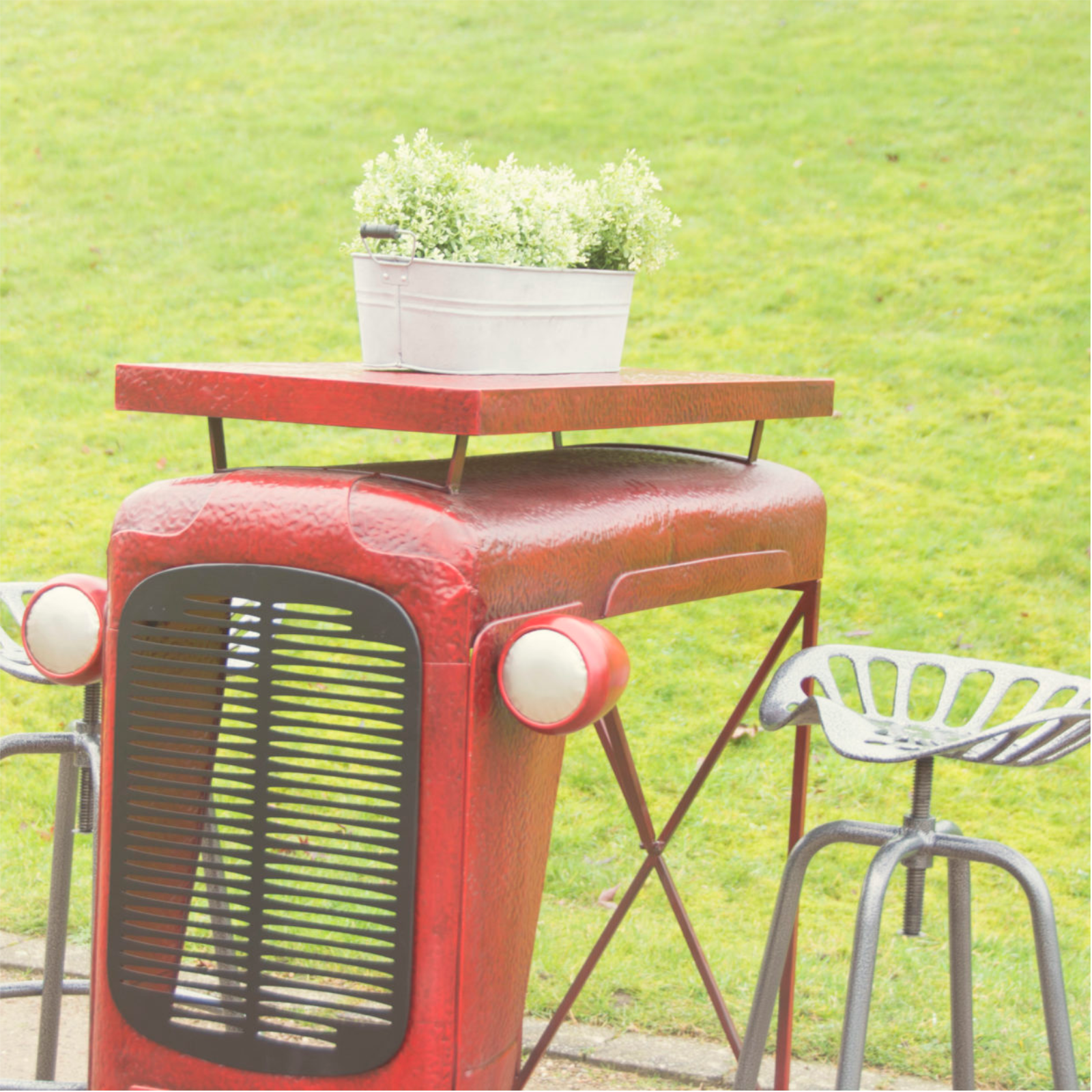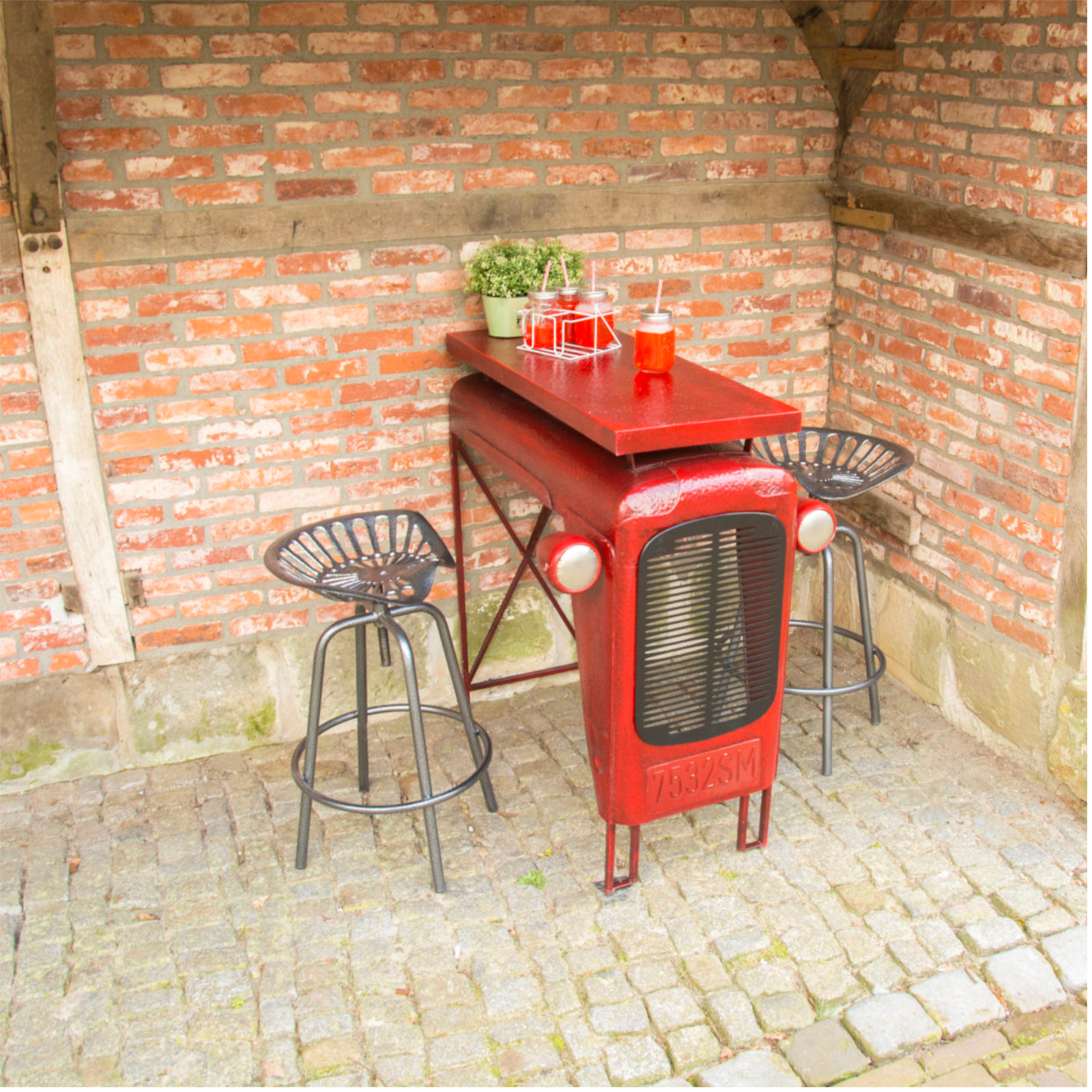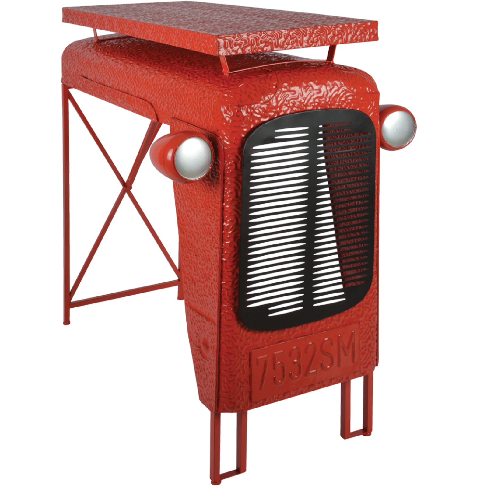 Ein Tisch mit Charakter – inspiriert von frühen Landmaschinen. Der markante Oldtimer-Look mit integriertem Grill und Scheinwerfern ist ein absoluter Stil-Garant.