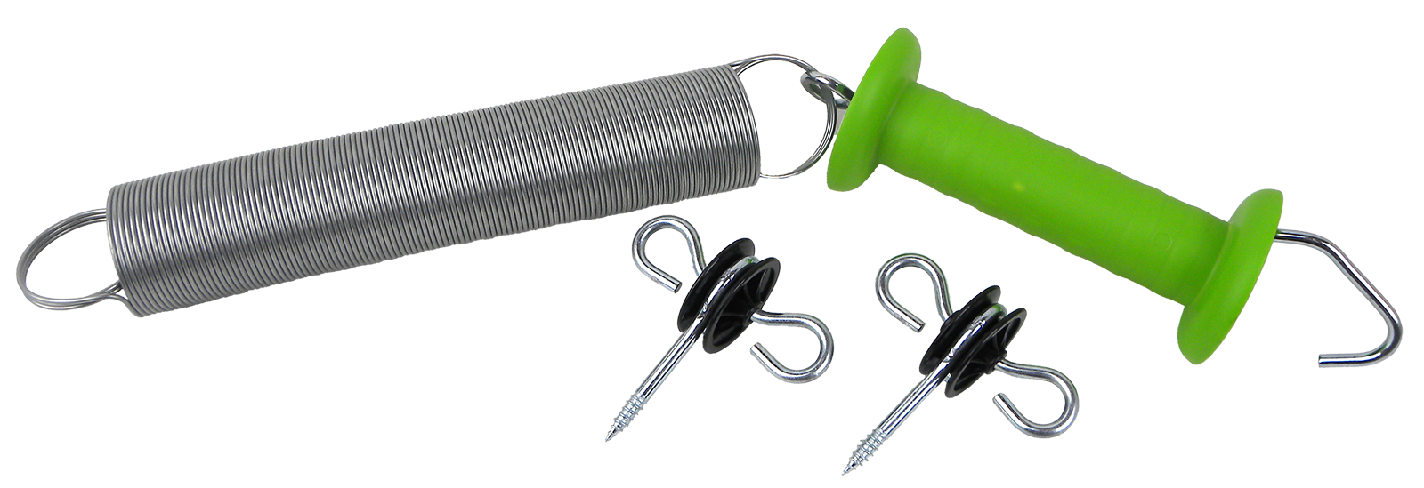 Set bestehend aus: 1 x Torgriff Standard mit breitem Handschutz, Haken und Zugfeder, 1 x Torfeder verzinkt auf 5m ausziehbar, 2 x Torgriffisolator schwarz mit 2 Ösen, Holzgewinde