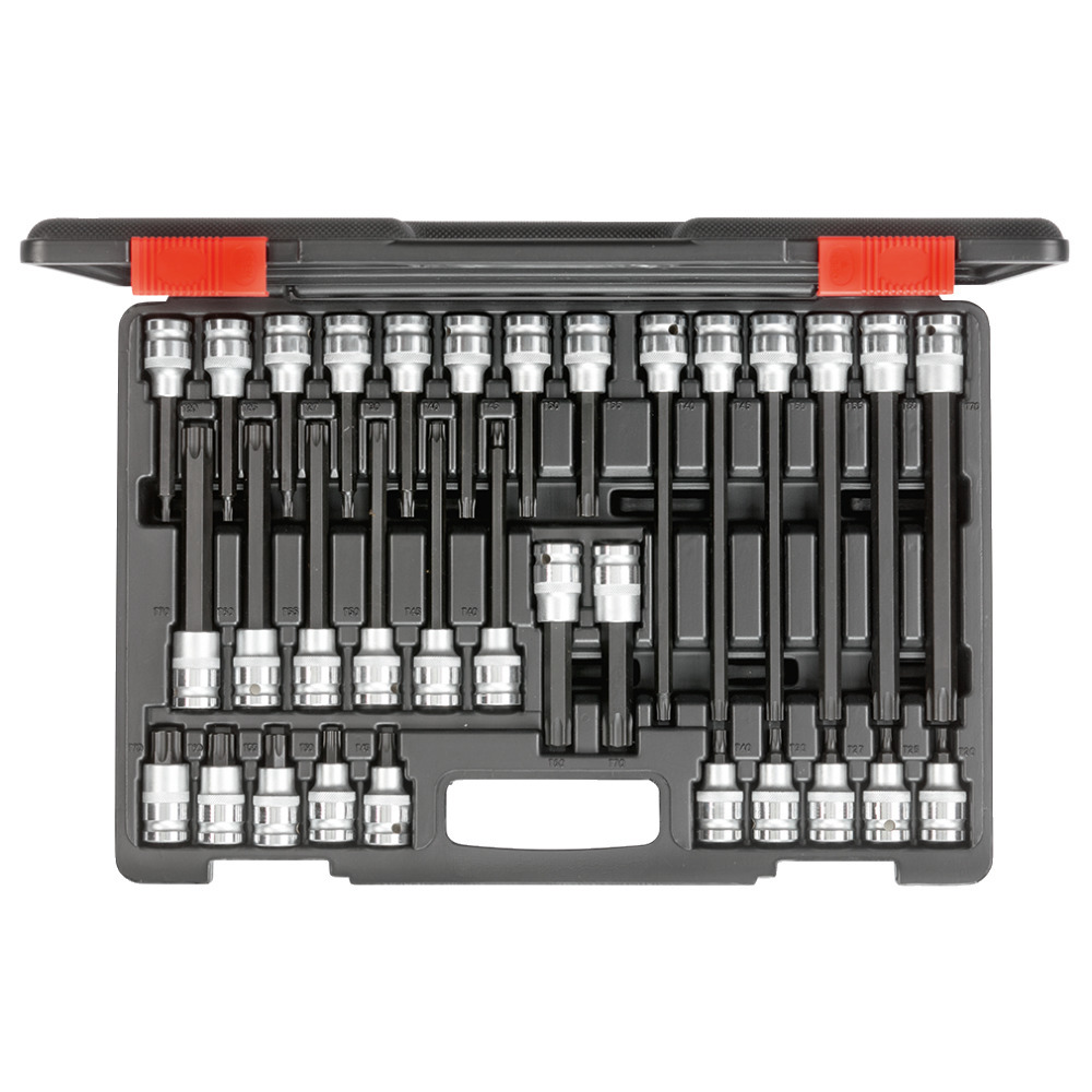 Praktischer Torx Schraubendrehersatz mit allen gängigen Torx Stecknussen bestückt.Mit 4 verschiedenen Längen, um für alle Individualitäten ausgerüstet zu sein. Dieser Satz darf in keiner Werkstatt fehlen!Inhalt:55mm Länge, ½“: T20, T25, T27, T30, T40, T45, T50, T55, T60, T70100mm Länge, ½“: T20, T25, T27, T30, T40, T45, T50, T55, T60, T70140mm Länge, ½“: T40, T45, T50, T55, T60, T70200mm Länge, ½“: T40, T45, T50, T55, T60, T70