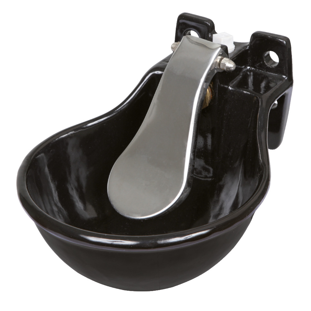 Große Trinkschale aus Grauguss, hochwertige Pulverbeschichtung, Druckzunge aus nicht rostendem Edelstahl. Wasseranschluss 1/2" von oben oder unten, Gewicht 3,7 kg, Beckenvolumen 1,45 Liter, geeignet für Wand- und Rohrbefestigung.