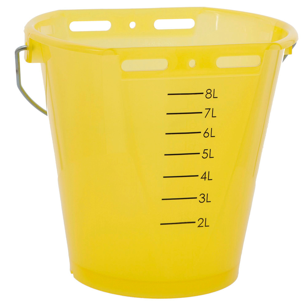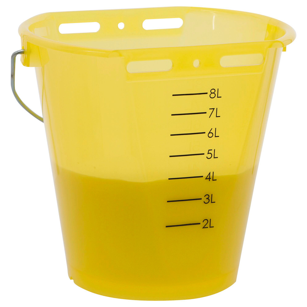 Vorteil: Der Füllstand ist leicht von der Ferne zu erkennen! Mit aufgedruckter Skala auf der Rückseite und zusätzlich einer eingeprägten Skala auf der Innenseite. Mit Metallbügel, säurebeständig, lebensmittelecht und leicht zu reinigen. Ohne Sauger und Ventil. Zu verwenden mit Schraubventilen, FixClip oder Hygieneventilen. Fassungsvermögen 8 Liter. Farbe: gelb transparent