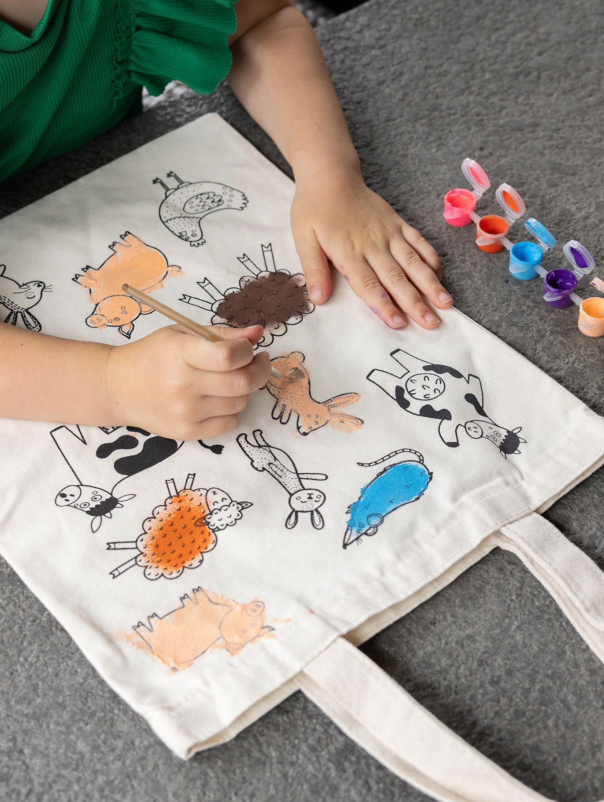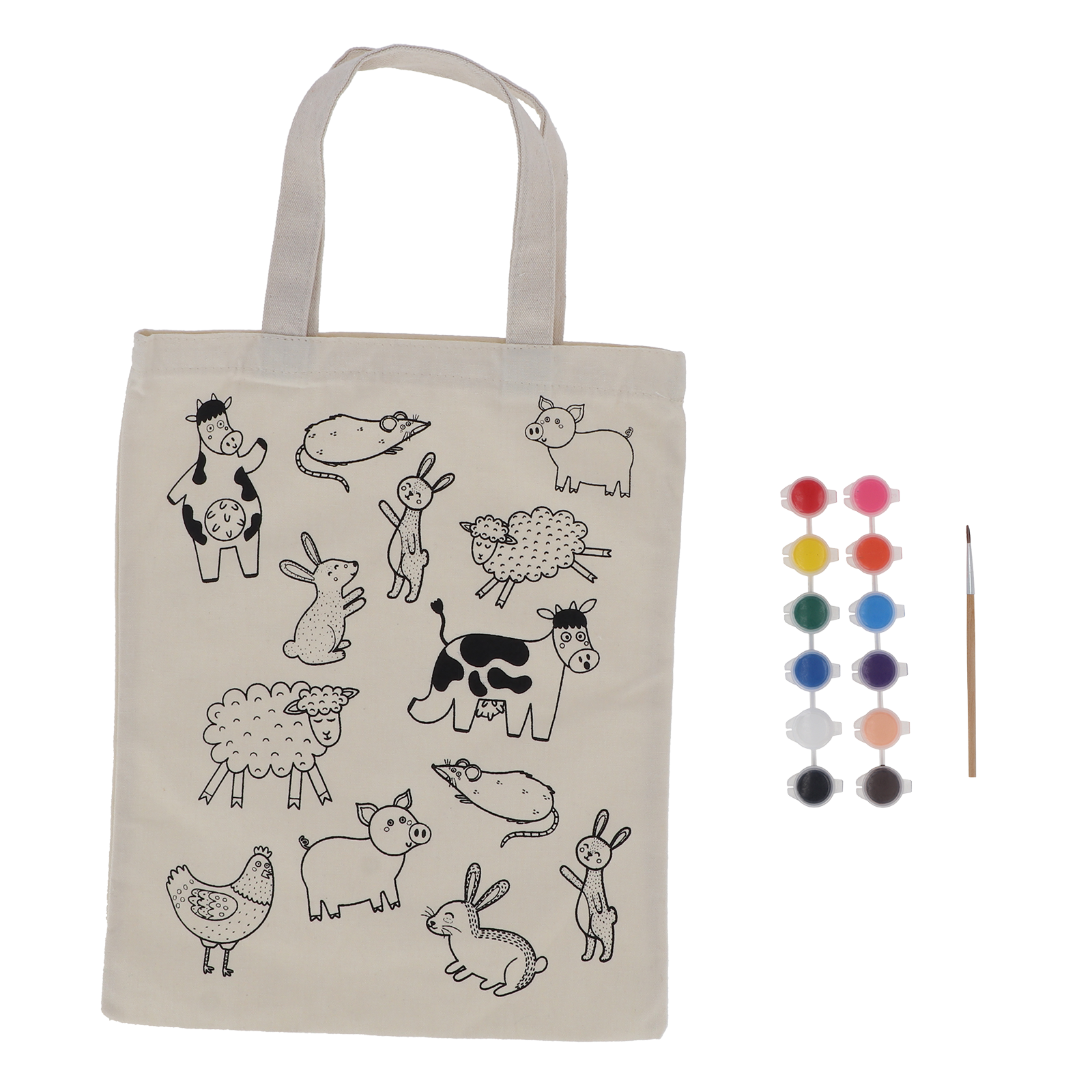 Gestalte deine eigene Bauernhof-Tasche!Lass deiner Kreativität freien Lauf und bemale deine Stofftasche mit fröhlichen Bauernhoftieren! Ob Kuh, Schwein, Huhn oder Schaf – mit den mitgelieferten Acrylfarben und Pinseln kannst du das vorgefertigte Motiv nach deinen Wünschen gestalten. Ein kreativer Spaß für Kinder und Erwachsene!Die Colour-in Bag vereint Kreativität mit Funktionalität. Die Tasche ist mit einem schönen Motiv bedruckt, das Kinder mit dem beiliegenden Pinsel selbst ausmalen können. So entsteht für jedes Kind ein einzigartiges und persönliches Design. Nach dem Bemalen ist die Tasche ideal für den täglichen Gebrauch. Farbe und Pinsel sind enthalten. Nach dem Bemalen sollte die Tasche 24 Stunden trocknen und anschließend auf der Rückseite gebügelt werden.Kreativ und lehrreichEnthält 10 verschiedene Farben und 2 Pinsel
