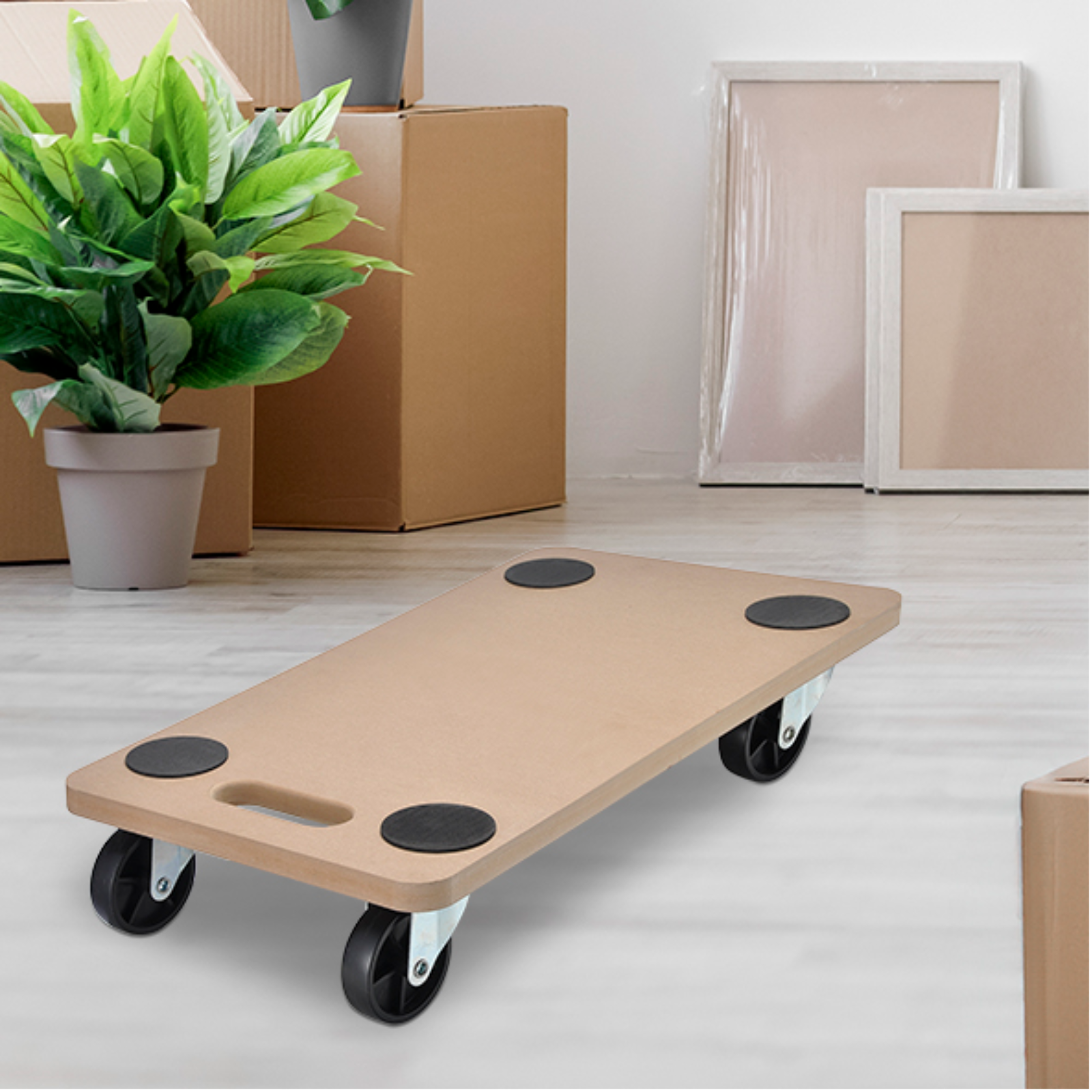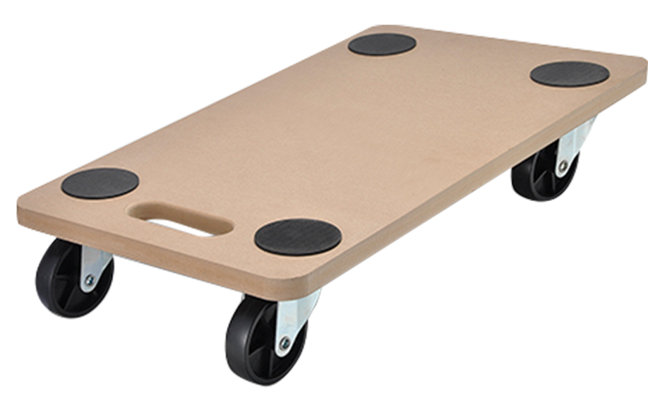 MDF-Platte mit 4 freidrehenden Rollen und Tragegriff,Oberseite mit 4 Anti-Rutschpunkten Abmessungen (LxBxH): 56 x 29,5 x 10,8cmMaterial: MDF, PP (Stärke der Platte: 1,8cm)Rollen Ø: 75 mm