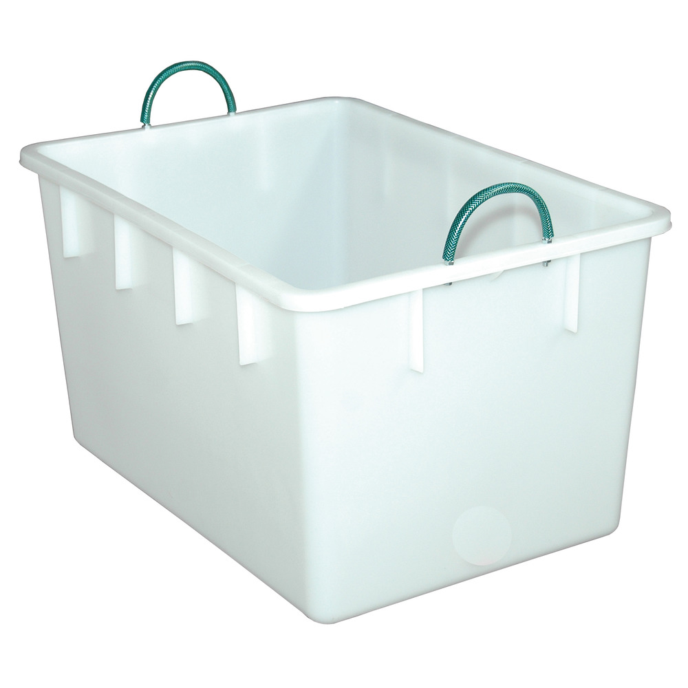 Lebensmittelechte Kunststoffwanne aus PE, weiß, mit Tragegriffen, leicht zu reinigen durch glatte Innenoberfläche, leere Behälter stapelbar, temperaturbeständig von -30°C bis +80°C
