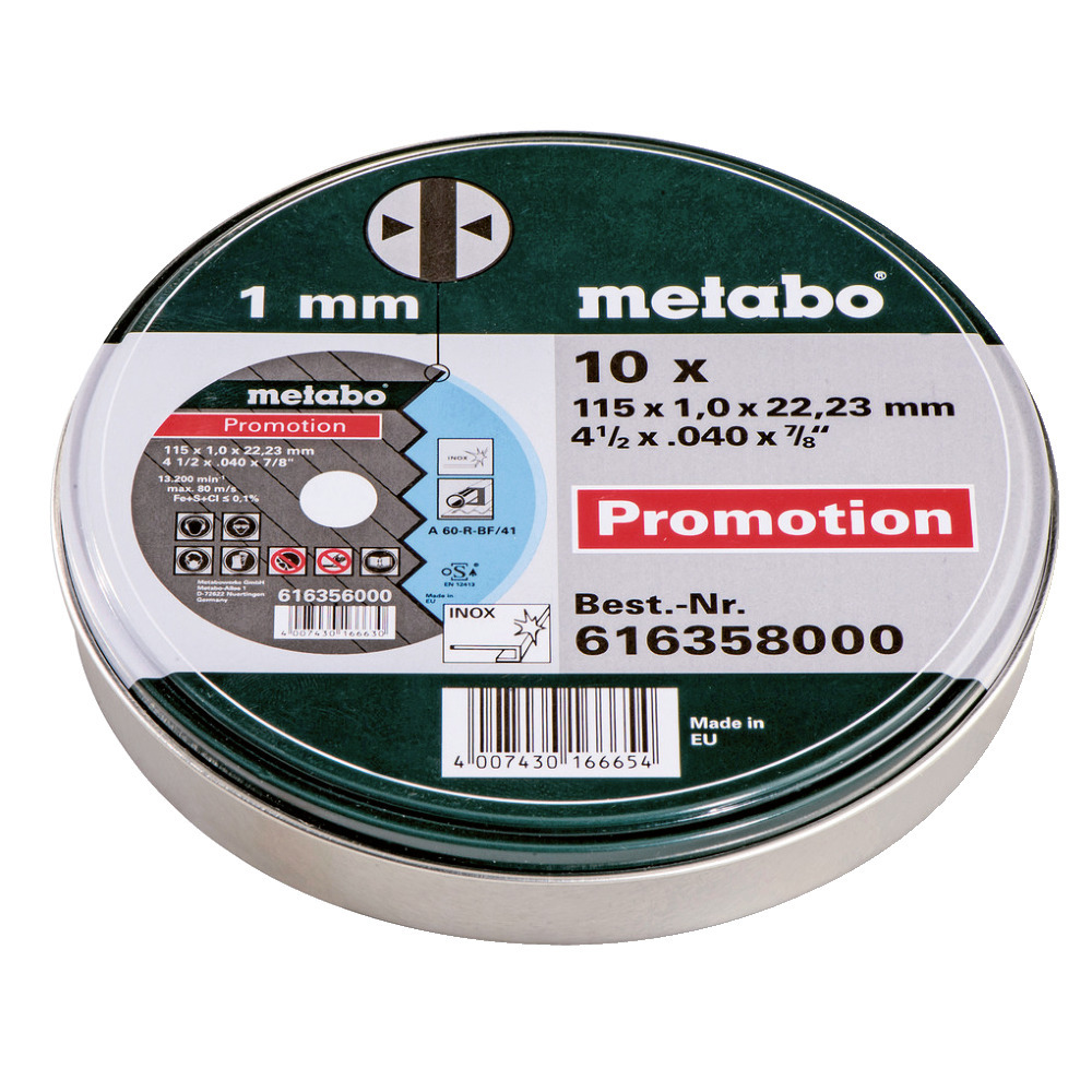 Universalscheiben Set mit 10 Stück Trennscheiben für Metall, Inox, bzw Edelstahlbearbeitung. Sehr gute Schnittleistung bei geringem Verschleiß. Scheibenstärke 1,0 mm. Lieferung in Blechdose.
