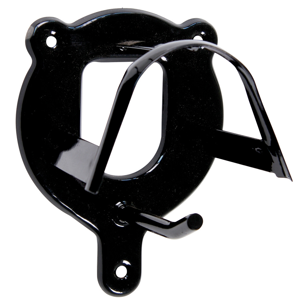 Mit langem Haken; Aus schwarzem Metall, mit 3 Bohrlöchern.