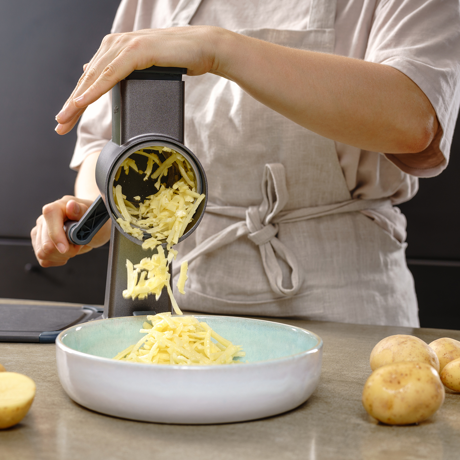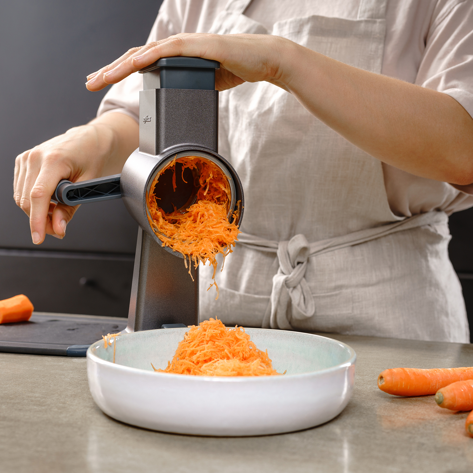 Ihr Küchenhelfer für schnelles und effizientes Reiben. Die Zyliss Alu Trommelreibe ist nicht nur für Profiköche eine Bereicherung, sondern auch für Hobbyköche und alle, die Wert auf eine gesunde und schnelle Küche legen. Die einfache Handhabung und schnelle Reinigung machen dieses Gerät zu einem unverzichtbaren Helfer in jeder Küche. Ob Sie eine große Familie zu versorgen haben oder einfach nur Wert auf frische und selbst zubereitete Mahlzeiten legen, die Zyliss Trommelreibe unterstützt Sie bei jedem Schritt. Das Design der Zyliss Alu Trommelreibe zeichnet sich durch seine hochwertige Aluminiumkonstruktion aus, die nicht nur für Langlebigkeit sorgt, sondern auch eine einfache Reinigung ermöglicht. Die Trommelreibe kommt mit verschiedenen Aufsätzen, sodass Sie die Größe und Form der geriebenen Lebensmittel nach Ihren Wünschen anpassen können: