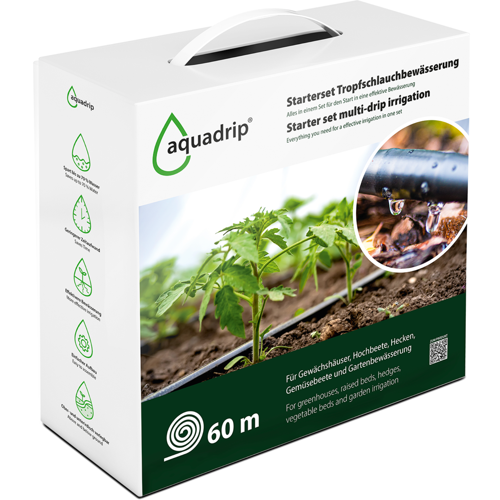 Dein Start in die perfekte Bewässerung von Hochbeet, Garten, Gewächshaus und Hecke.Wenn es um Bewässerung von Pflanzen geht, ist die Tropfschlauchbewässerung die effektivste Methode, bei der man auch noch jede Menge Wasser spart.Das aquadrip® Starterset beinhaltet alles, was Sie für den Anfang benötigen. Es ist einfach zu installieren und erweiterbar.Im Vergleich zu herkömmlichen Systemen kann aquadrip® mehr: durch eine Druckkompensationsmechanik bleibt die Wasseraustrittsrate bei variierendem Wasserdruck gleich und gewährleistet damit eine gleichmäßige Bewässerung der Pflanzenreihen. Zusätzlich bietet die Technologie Schutz vor eintretendem Schmutz, womit man aquadrip® sowohl ober- als auch unterirdisch verlegen kann.Technische Daten:Schlauchlänge 60 m, Schlauch-Ø 16 mm, Wandstärke 0,90 mm, Tropferabstand 33 cm, Durchflussrate ca. 2 l/h. Druckbereich 0,8 - 4,0 bar.Set bestehend aus: Tropfschlauch 60 m, Druckminderer mit Filtersieb, Hahnanschluss und Schlauchadapter, 5 L-Verteiler, 5 Schlauchkupplungen, 5 T-Verteiler, 5 Endstücke, 20 Montageanker