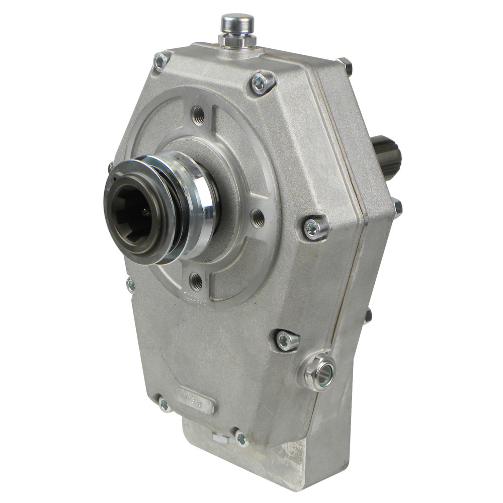 Übersetzungsgetriebe für Hydraulikpumpen der Baugruppe 2 oder 3 mit Aufsteck-Schnellverschluss. Das Getriebe hat einen Durchtrieb auf einen Zapfwellenstummel 1 3/8 x 6. Das Übersetzungsverhälktnis ist 1 : 3,8. Bei Verwendung einer Hydraulikpumpe der Baugruppe 2 ist ein Zentrierring (Faie Nr. 112326) zu verwenden. Dieser Ring reduziert den Zentriersitz der BG 3 von 50,8mm auf den Durchmesser des Zentriersitzes der BG 2 von 36,5mm.