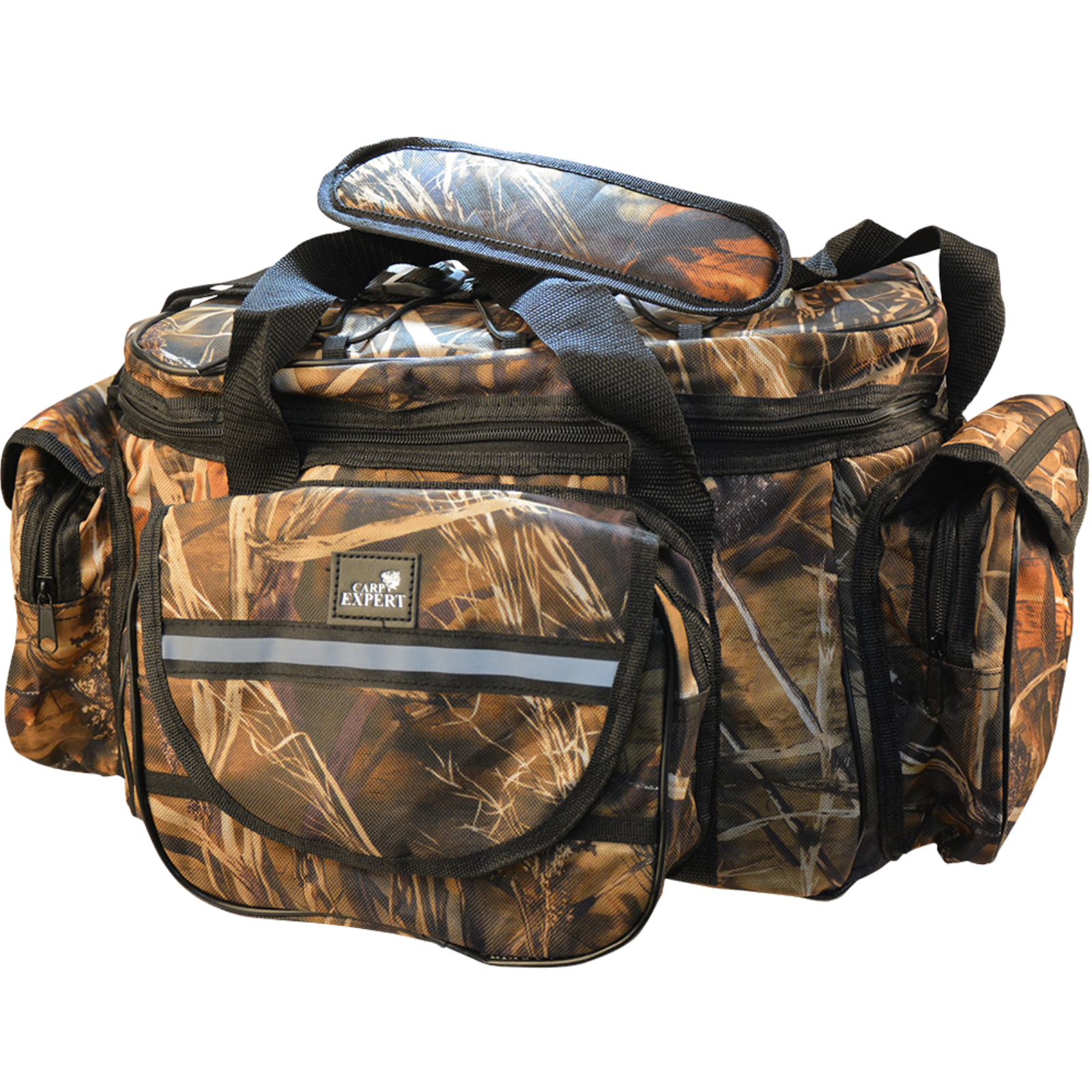 Carp Expert Camou SchultertascheDie Carp Expert Camou Schultertasche ist ein vielseitiger Begleiter am Wasser.Mit einer Größe von 25 x 50 cm bietet sie ausreichend Platz für Ausrüstung, bleibt dabei aber handlich.Durch ihr durchdachtes Design kann sie viele Aufgaben übernehmen – von der Aufbewahrung großer Boxen bis hin zum Transport kleiner Zubehörteile.Aufteilung und Stauraum:Das Hauptfach misst 30 x 20 x 20 cm und lässt sich mit Klett-Trennwänden flexibel unterteilen.Ob zwei, drei oder vier Fächer – Sie bestimmen selbst, wie Sie Ihre Boxen oder Rollen unterbringen.Praktische Außentaschen:Zwei Seitentaschen (18 x 18 x 7 cm) für Werkzeug oder Kleinteile.Eine Vordertasche (23,5 x 18 x 7 cm) für Angelpapiere, Waage, Stift oder Müllbeutel. Alles Wichtige bleibt griffbereit.Komfort beim Transport:Die Tasche hat stabile Handgriffe und einen gepolsterten Schultergurt mit über 1 m Länge.So bleibt auch ein längerer Weg zum Angelplatz angenehm.Maße: 25 x 50 cm